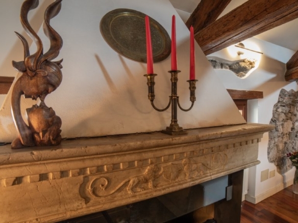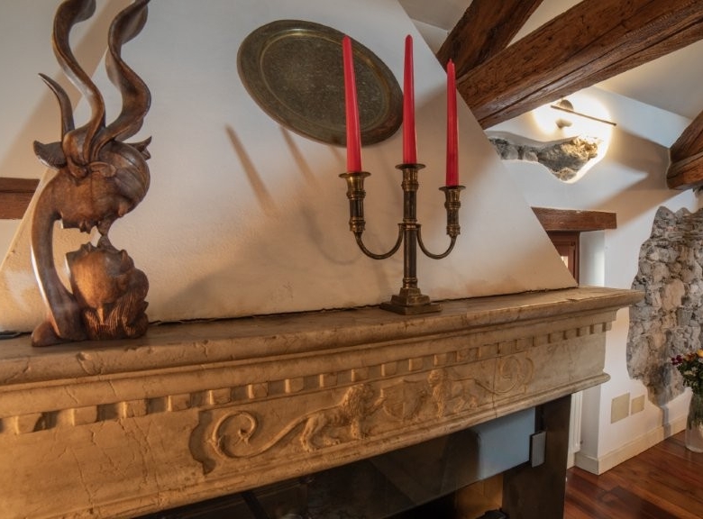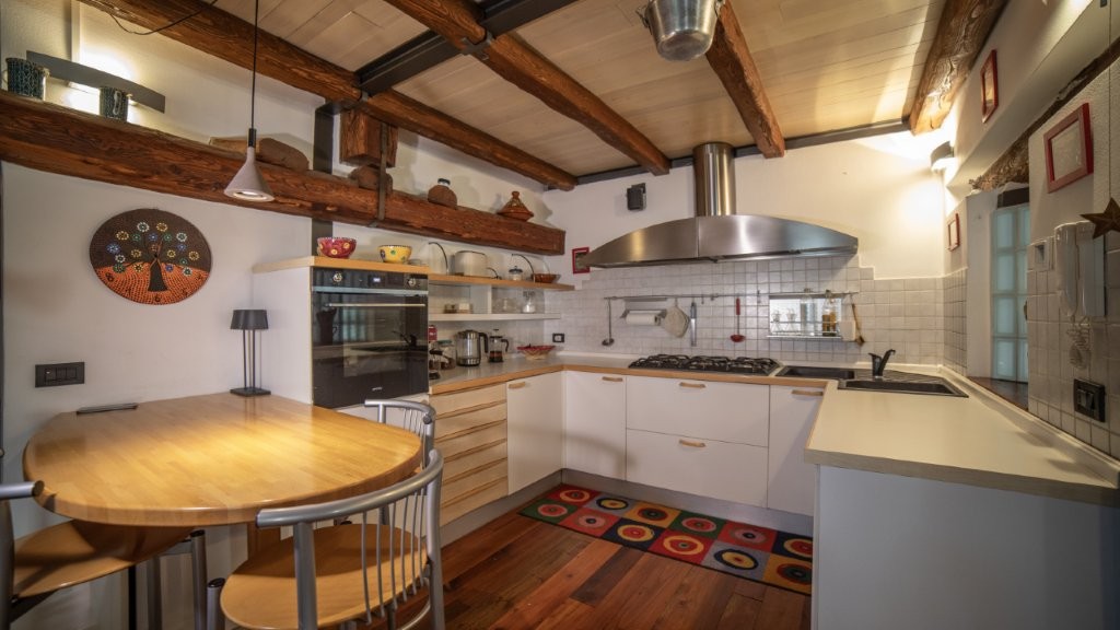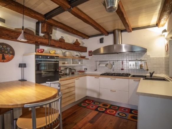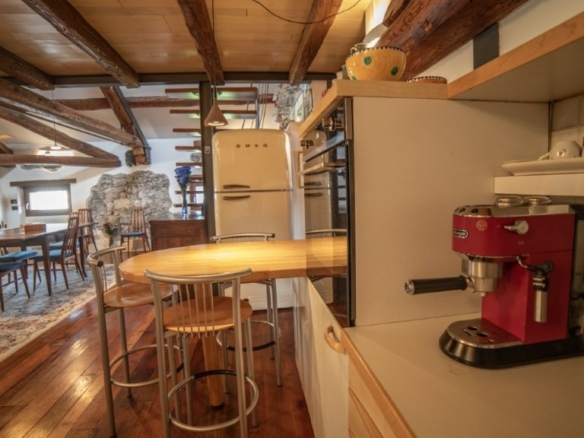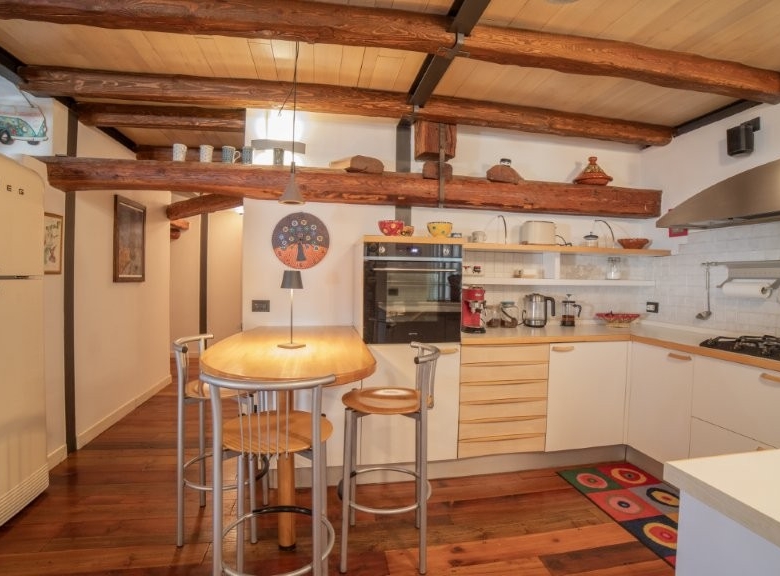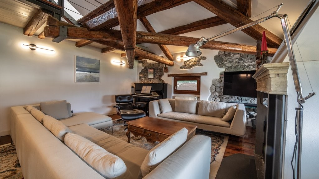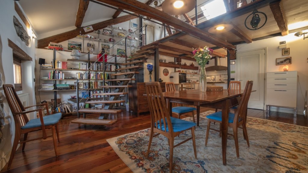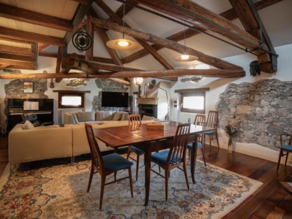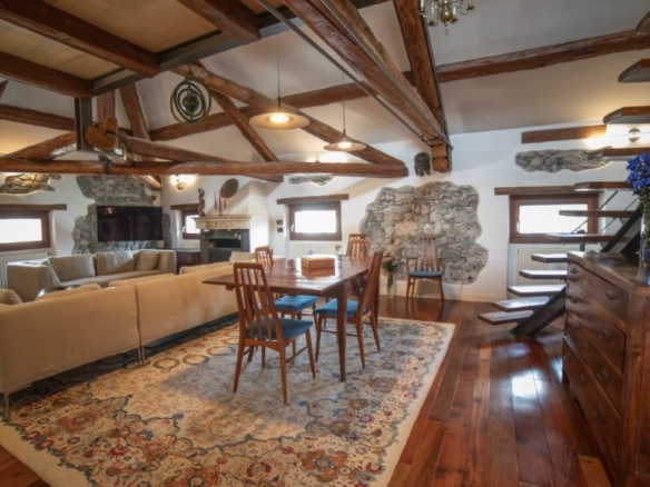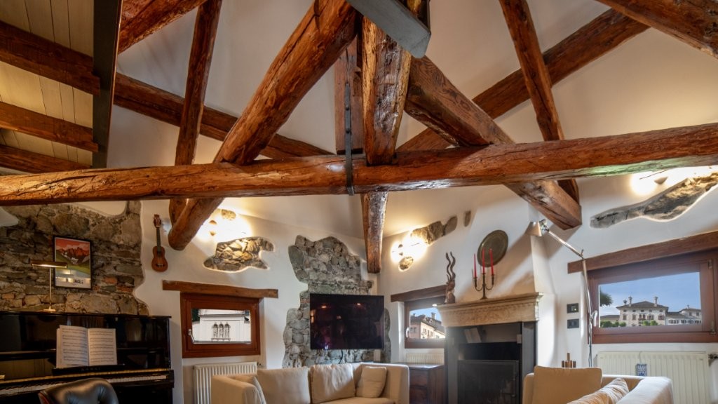 Step inside, and the heart of the home immediately captures attention: a vast living area designed for comfort and entertainment. This grand space is characterized by stunning exposed beams that highlight the architectural integrity of the building, a charming fireplace that promises cozy evenings, and an original stone wall that adds a touch of rustic elegance and historical authenticity. This blend of natural materials and classic design creates an inviting atmosphere, perfect for both intimate gatherings and larger celebrations.