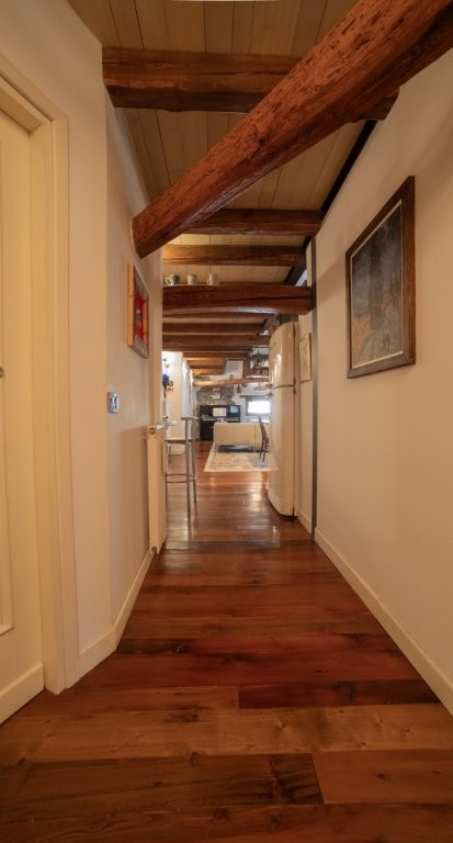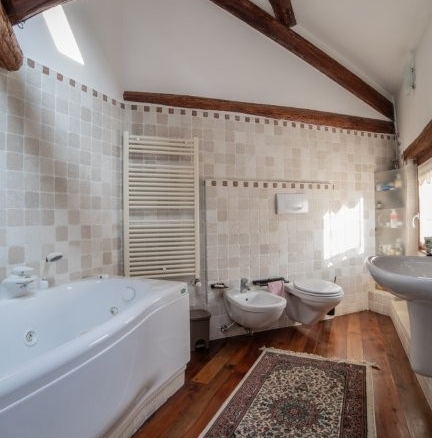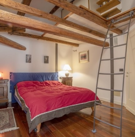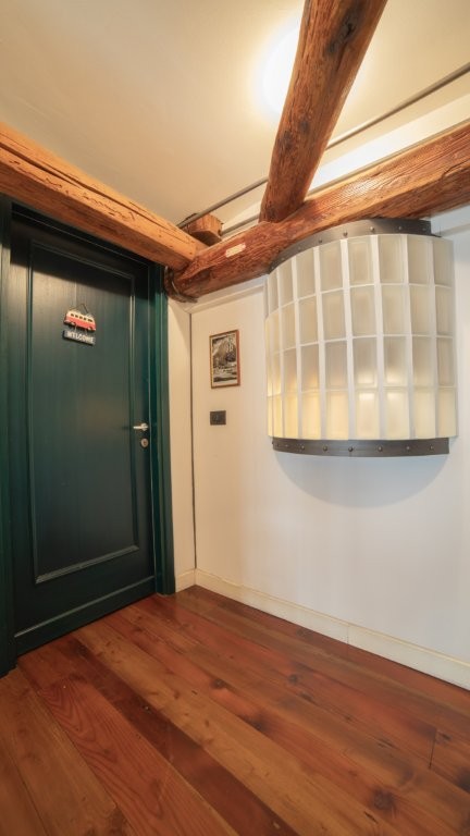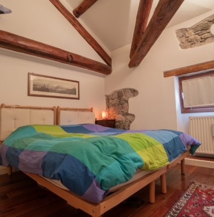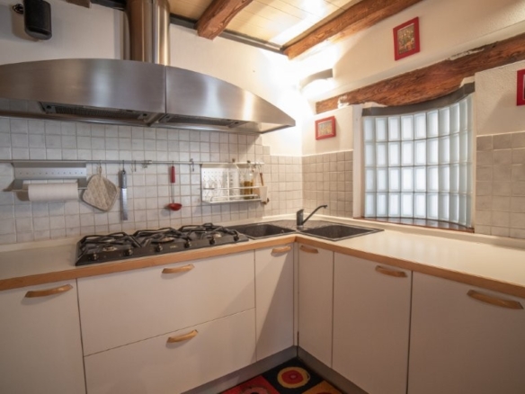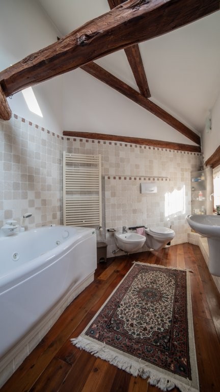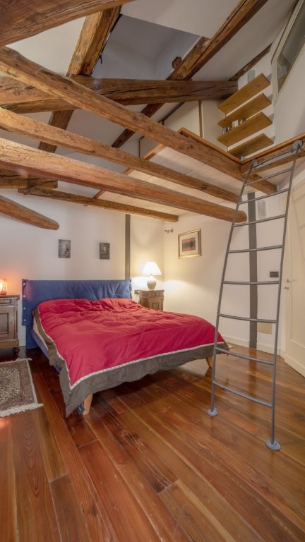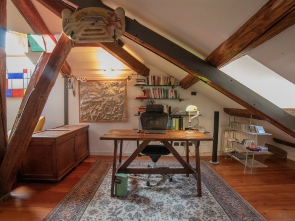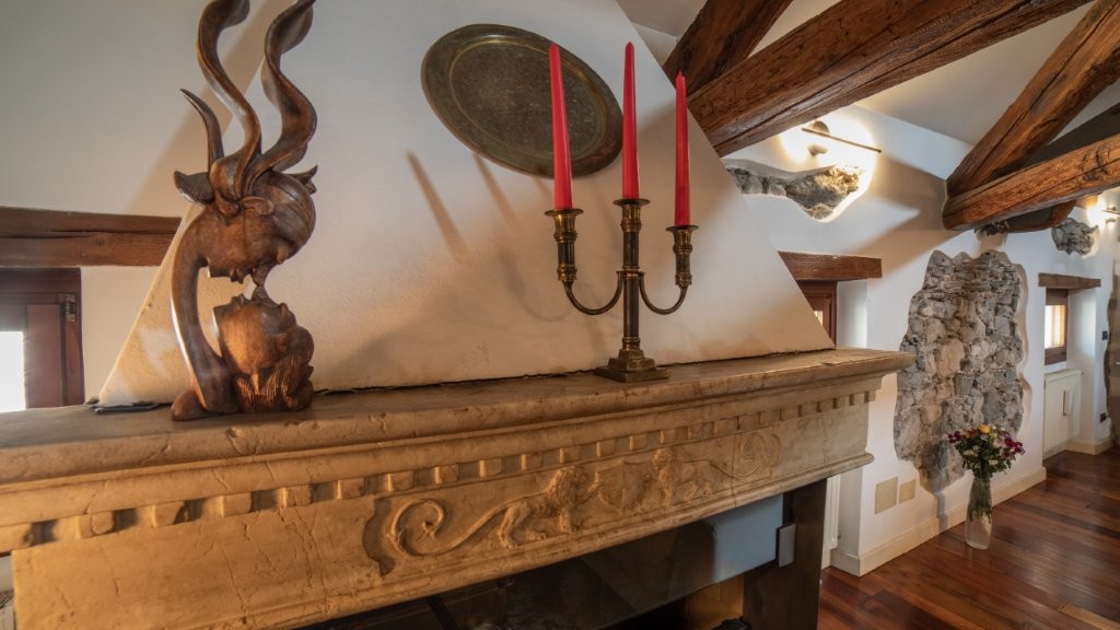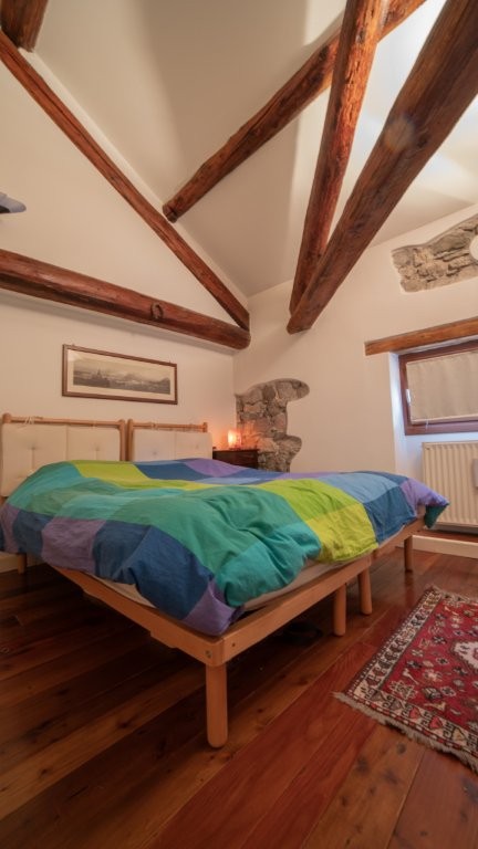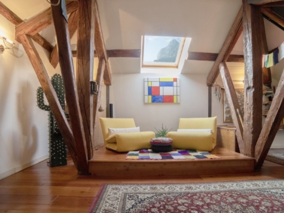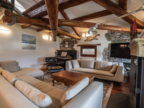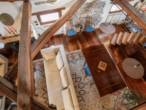 Step inside, and the heart of the home immediately captures attention: a vast living area designed for comfort and entertainment. This grand space is characterized by stunning exposed beams that highlight the architectural integrity of the building, a charming fireplace that promises cozy evenings, and an original stone wall that adds a touch of rustic elegance and historical authenticity. This blend of natural materials and classic design creates an inviting atmosphere, perfect for both intimate gatherings and larger celebrations.