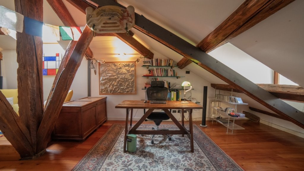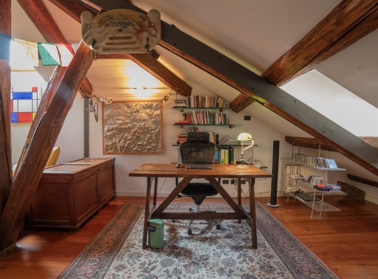 The thoughtful layout of the penthouse includes two well-appointed bedrooms, ensuring comfortable accommodation for residents and guests. Complementing these are three meticulously designed bathrooms, offering convenience and luxury. A substantial walk-in closet provides abundant storage for clothing and personal belongings, contributing to the property’s overall functionality and appeal. Furthermore, a habitable attic space presents a versatile area, currently configured as a study and a relaxation zone, offering a quiet sanctuary for work or leisure with inspiring views. The roof has been meticulously renovated with excellent insulation, ensuring energy efficiency and year-round comfort. The multi-sided exposure of the apartment allows natural light to flood the interiors throughout the day, enhancing the sense of space and warmth.