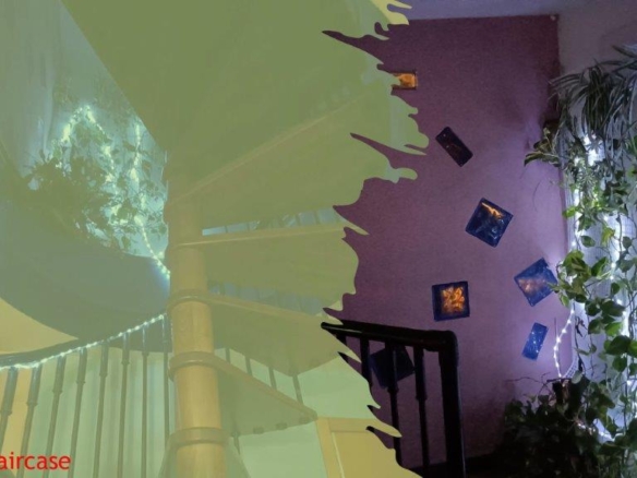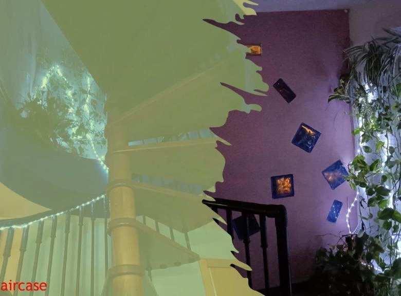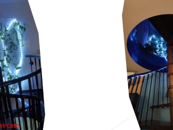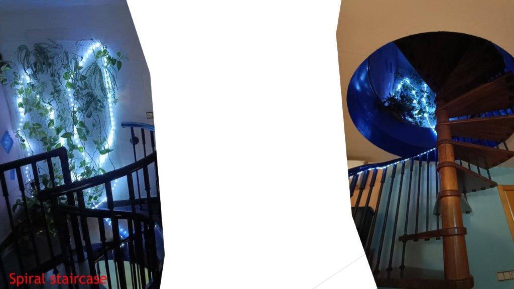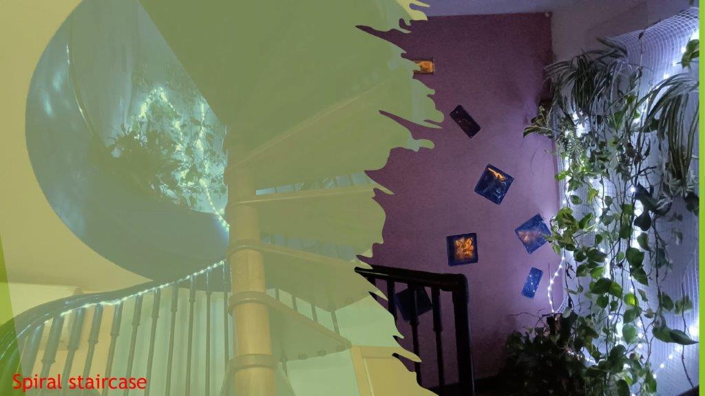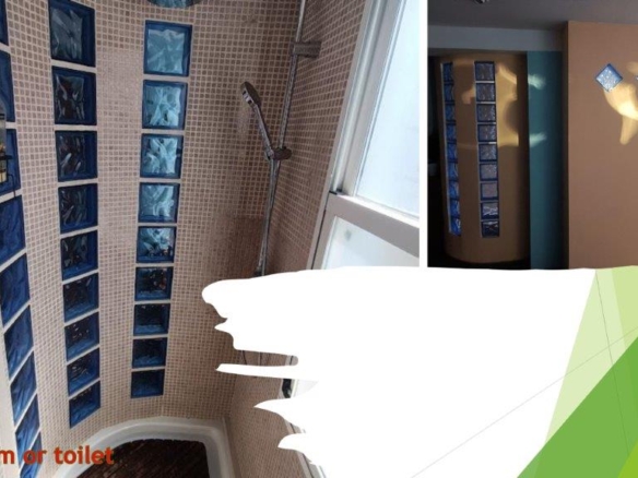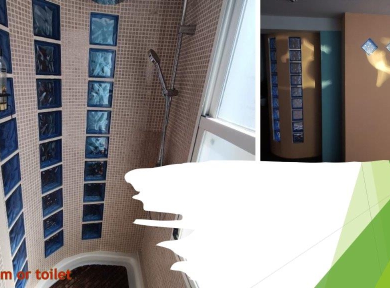 * Modern Bathroom: The first floor boasts a unique and stylish bathroom with curved shapes and blue glass blocks that allow for natural light.