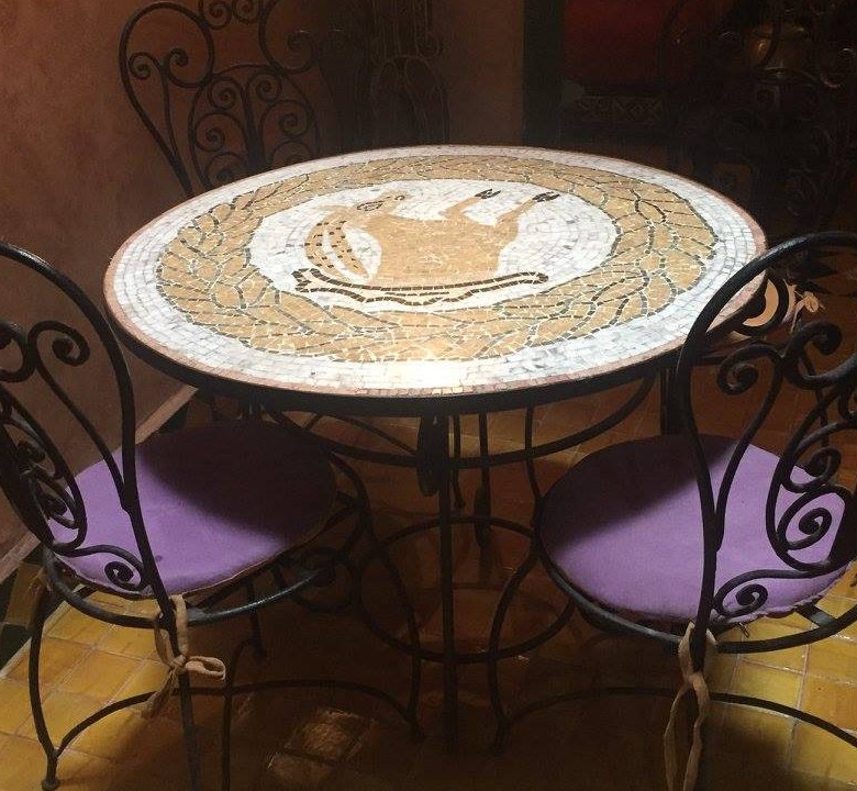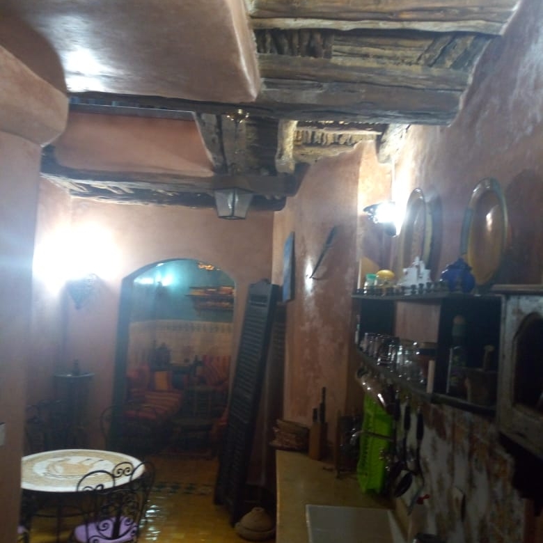 You enter through the original front door which is around 150 years old. Beyond that is a WC, then an open plan kitchen and dining area under the riad style glass roof. To the rear a living room. All the tiles are hand made and painted from Safi.
