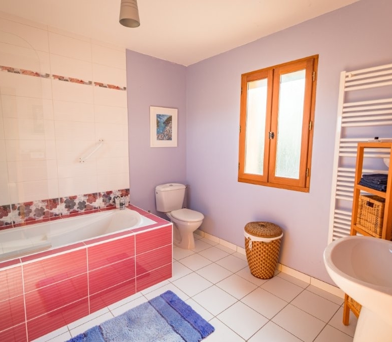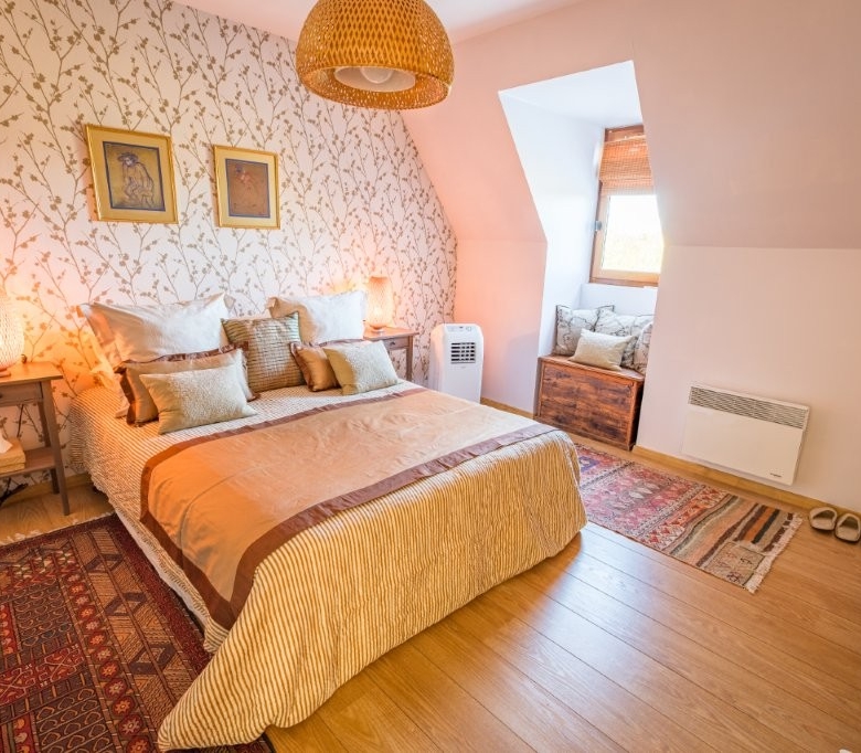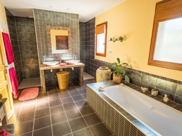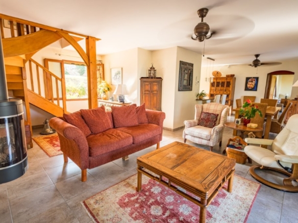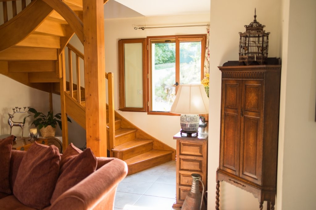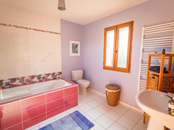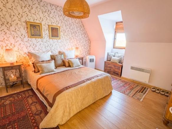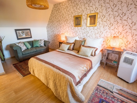 Ascending to the upper floor via an elegant open wooden staircase, you arrive at a landing that also serves as a comfortable seating area, offering a pleasant space for relaxation or reading. The upper level houses two further well-proportioned double bedrooms, providing comfortable and private accommodation for family or guests. A beautifully appointed bathroom is cleverly integrated within the charming pigeonnier architectural feature, a traditional element of Quercy houses, adding a touch of character and architectural interest to the upper level.