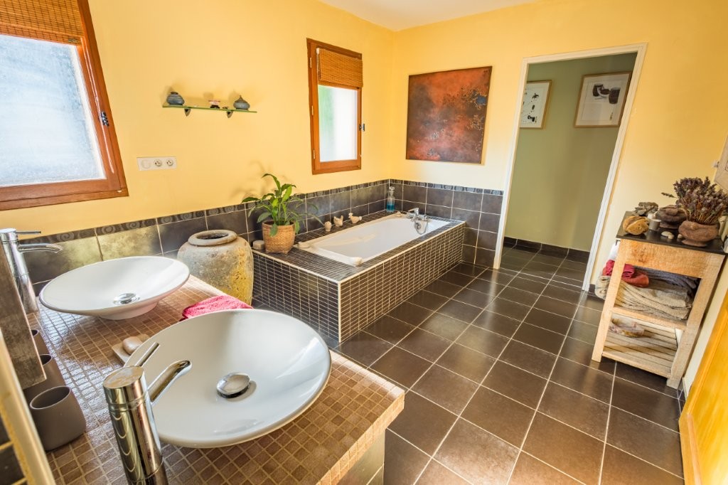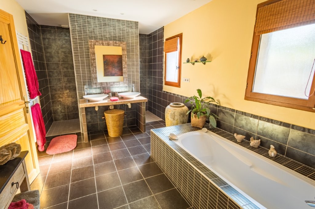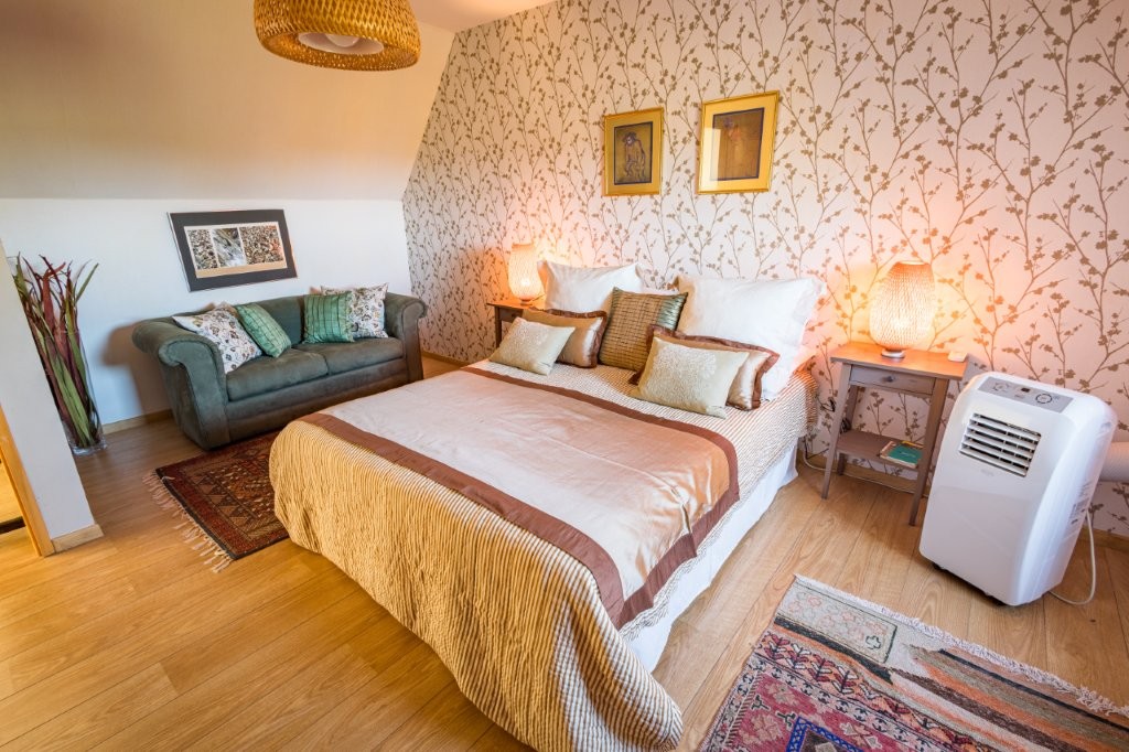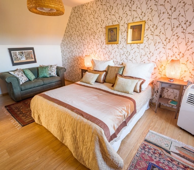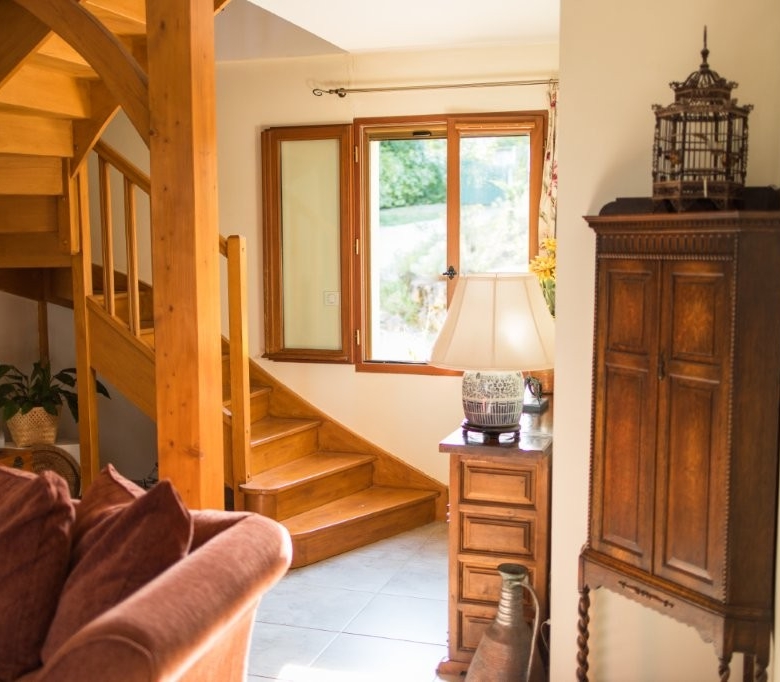 Ascending to the upper floor via an elegant open wooden staircase, you arrive at a landing that also serves as a comfortable seating area, offering a pleasant space for relaxation or reading. The upper level houses two further well-proportioned double bedrooms, providing comfortable and private accommodation for family or guests. A beautifully appointed bathroom is cleverly integrated within the charming pigeonnier architectural feature, a traditional element of Quercy houses, adding a touch of character and architectural interest to the upper level.