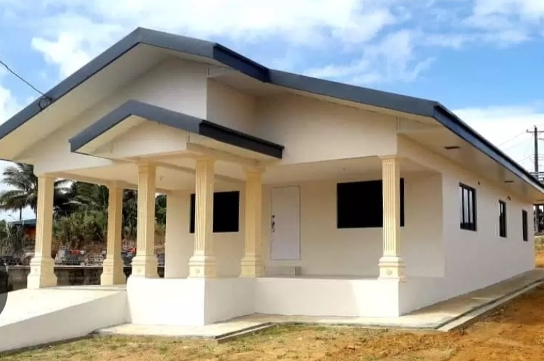 This modern bungalow-style home welcomes you with a large front area, perfect for creating a beautiful lawn or expanding the house to suit your needs. The expansive green space extends to the back of the property, offering ample room for outdoor activities and relaxation. A sheltered front veranda provides a welcoming space to relax and enjoy the tropical breeze, while a dedicated parking area to the right offers space for two vehicles. A paved path (skirting) surrounds the entire house, adding a touch of elegance and ensuring easy maintenance. A water tank at the back of the house, connected to the plumbing system, provides an extra water supply, complemented by a convenient yard pipe for outdoor use.