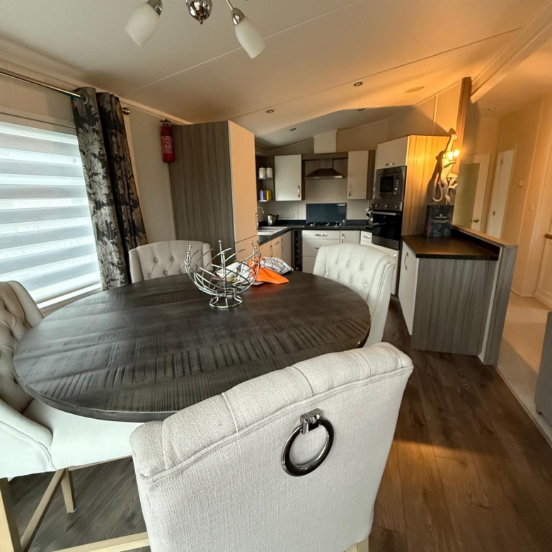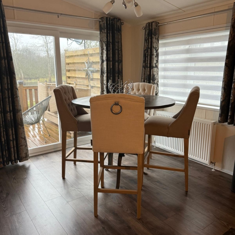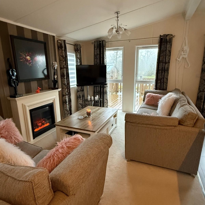 The sale of the lodge includes a comprehensive inventory of fixtures and fittings, allowing for a seamless transition for the new owners. Blinds and curtains are fitted throughout, providing privacy and light control. The modern integrated kitchen comes complete with a fridge freezer and a washing machine, ensuring immediate functionality. The dining area is furnished with a table and chairs, perfect for family meals or entertaining guests. The comfortable lounge includes a television, a coffee table, and a wall unit, creating a welcoming and functional living space.