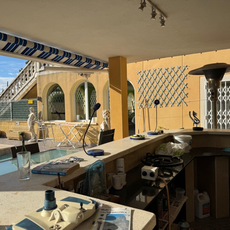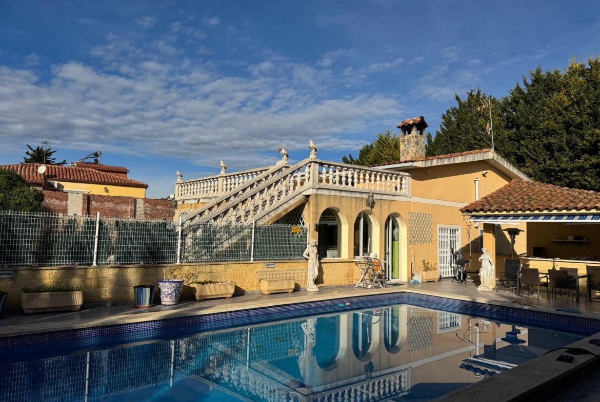 The true heart of this property lies in its spectacular outdoor spaces, meticulously designed for leisure, relaxation, and entertaining. The expansive 1,960 m2 plot is a private oasis, centered around a magnificent private pool and Jacuzzi. This area is the perfect spot for cooling off on a warm afternoon, unwinding with a glass of wine, or simply enjoying moments of peace under the Spanish sun. Beyond the pool, a dedicated barbecue area provides an ideal setting for al fresco dining and social gatherings, allowing you to host unforgettable parties and family get-togethers.