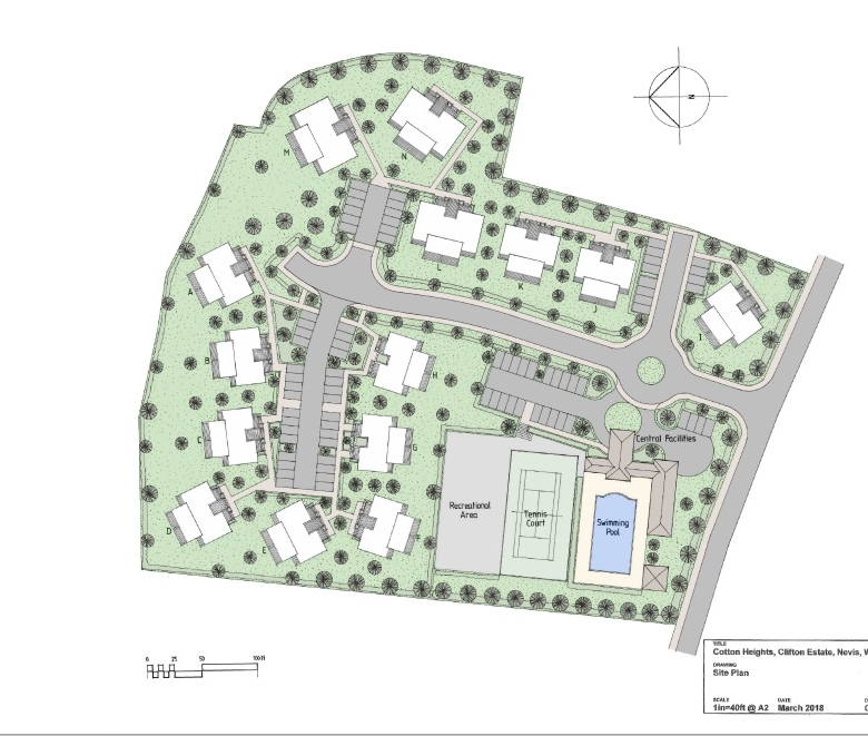 5 acres of land on the leeward (west) coast of Nevis with planning concept approval for a scheme of 52 condominium units (mix of single and two-storey) supported by central facilities (bar restaurant, gym, sales off, store, plant/store room) recreation area, tennis court and communal pool with connections to required utility services abutting the land. The development is designated as an ‘Approved Project’ under the Citizenship by Investment Programme.