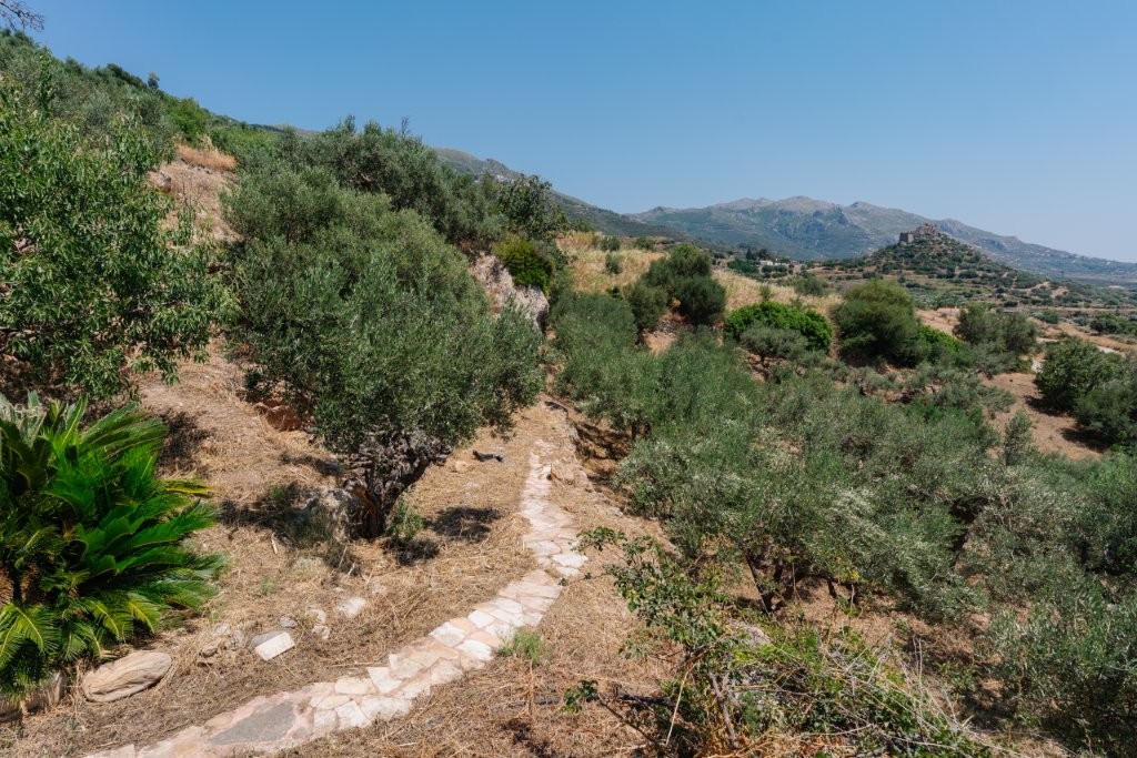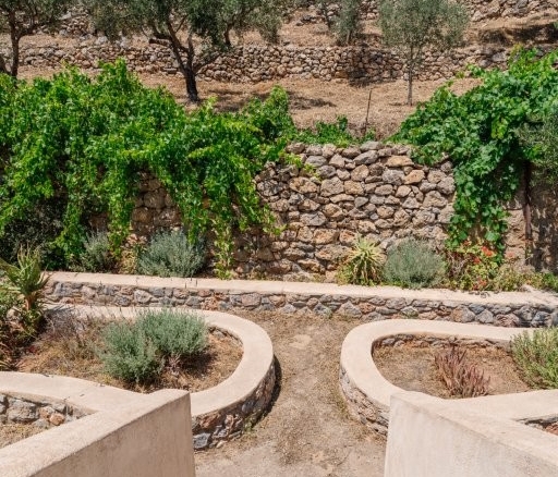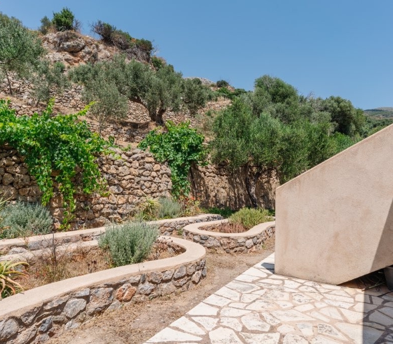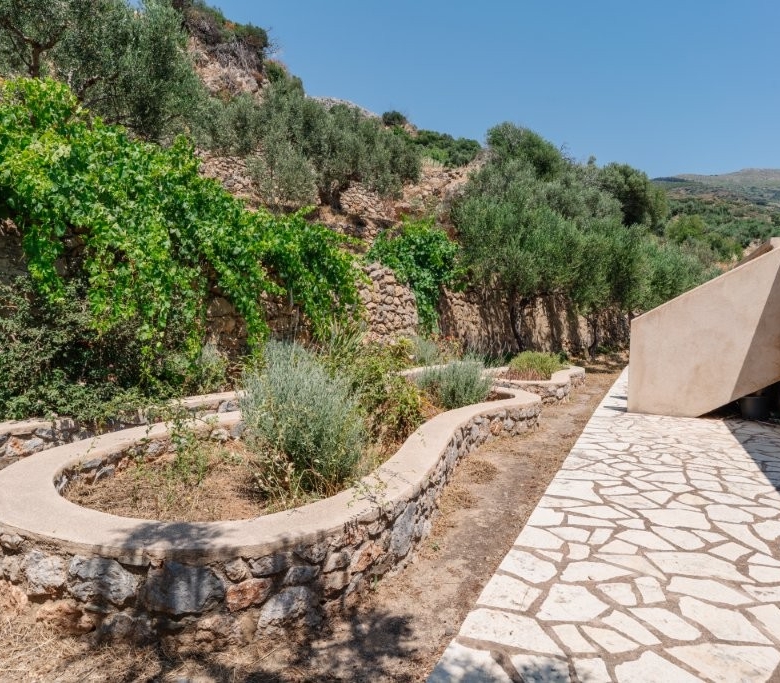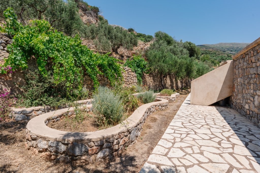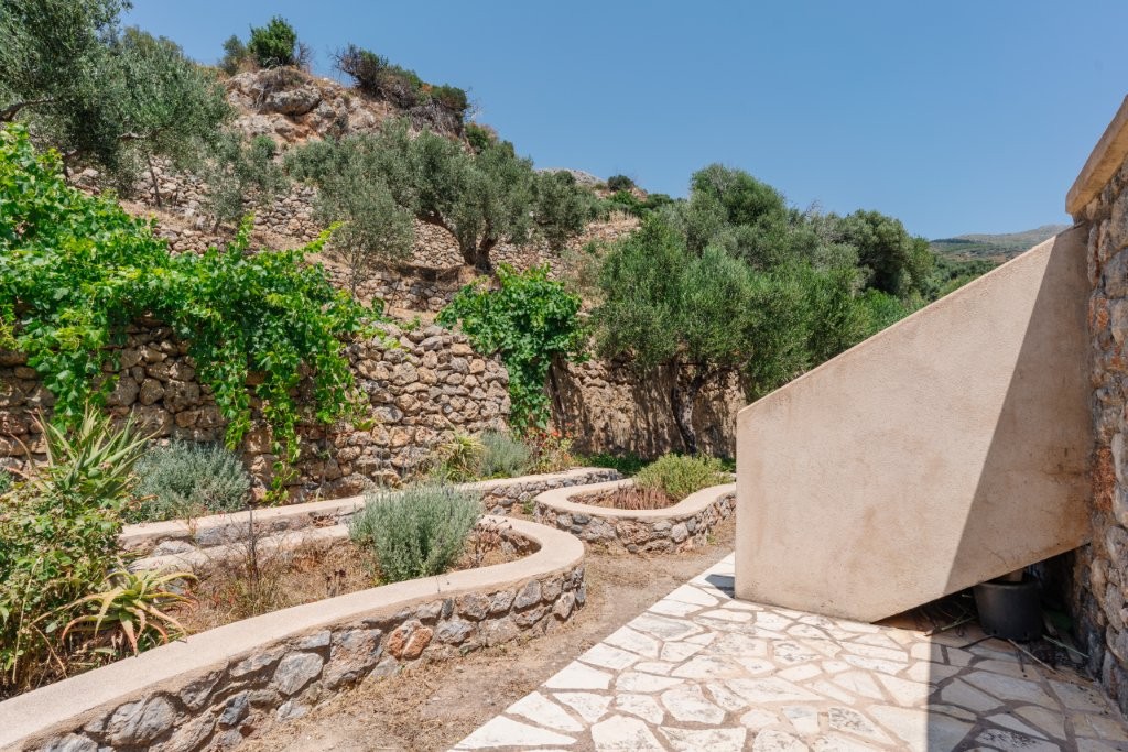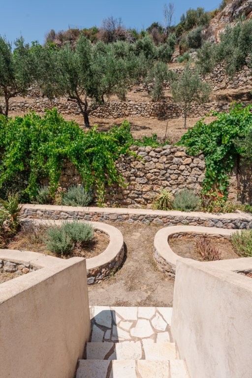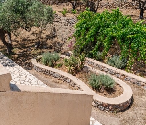 Beyond the olive grove, the dedication to sustainable living and self-sufficiency is evident in the meticulously cared-for garden situated on the terrace directly above and behind the house. Here, you’ll find three raised beds, perfect for cultivating your own organic vegetables or vibrant flowers, adding a splash of color and fresh produce to your daily life. The property also boasts a delightful array of fruit trees, including two lemon trees, two pomegranate trees, one mulberry tree, and a fig tree, offering a seasonal bounty of fresh fruit. Adding to the tropical charm, a prolific passion fruit vine thrives, providing exotic flavors right at your doorstep. Access to the main residence is both practical and aesthetically pleasing, with a charming stone footpath leading from the convenient parking area directly to the house, setting the tone for the rustic elegance within.