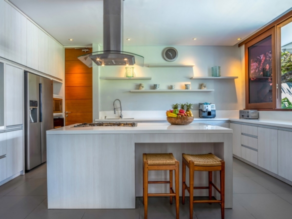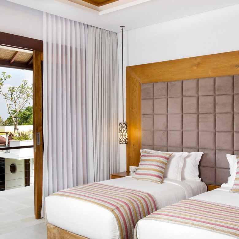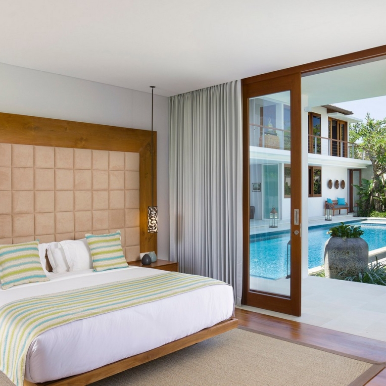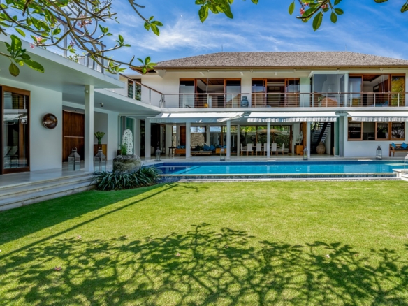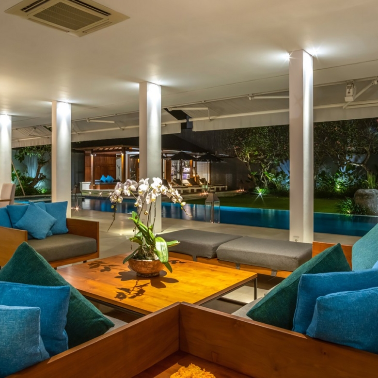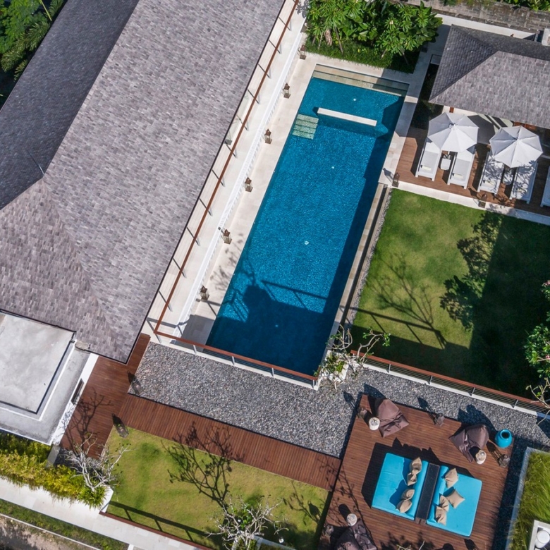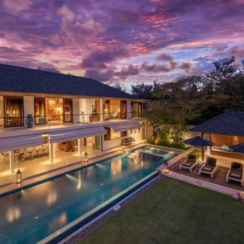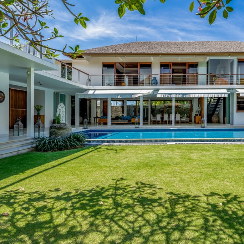 Built in 2012, the interiors are fresh with white walls and smooth creamy Palimanan stone floors, accented by warm honey-hued timber, modern impressionist artwork, richly textured furnishings and a smattering of Indonesian ethnic artefacts. Set on 900 sqm of land with a property size of 700 sqm over 2 levels, the villa has a spacious open plan living area with a grand dining table with views of the pool and pretty garden. There is also an entire area dedicated for staff and parking for 5 cars.