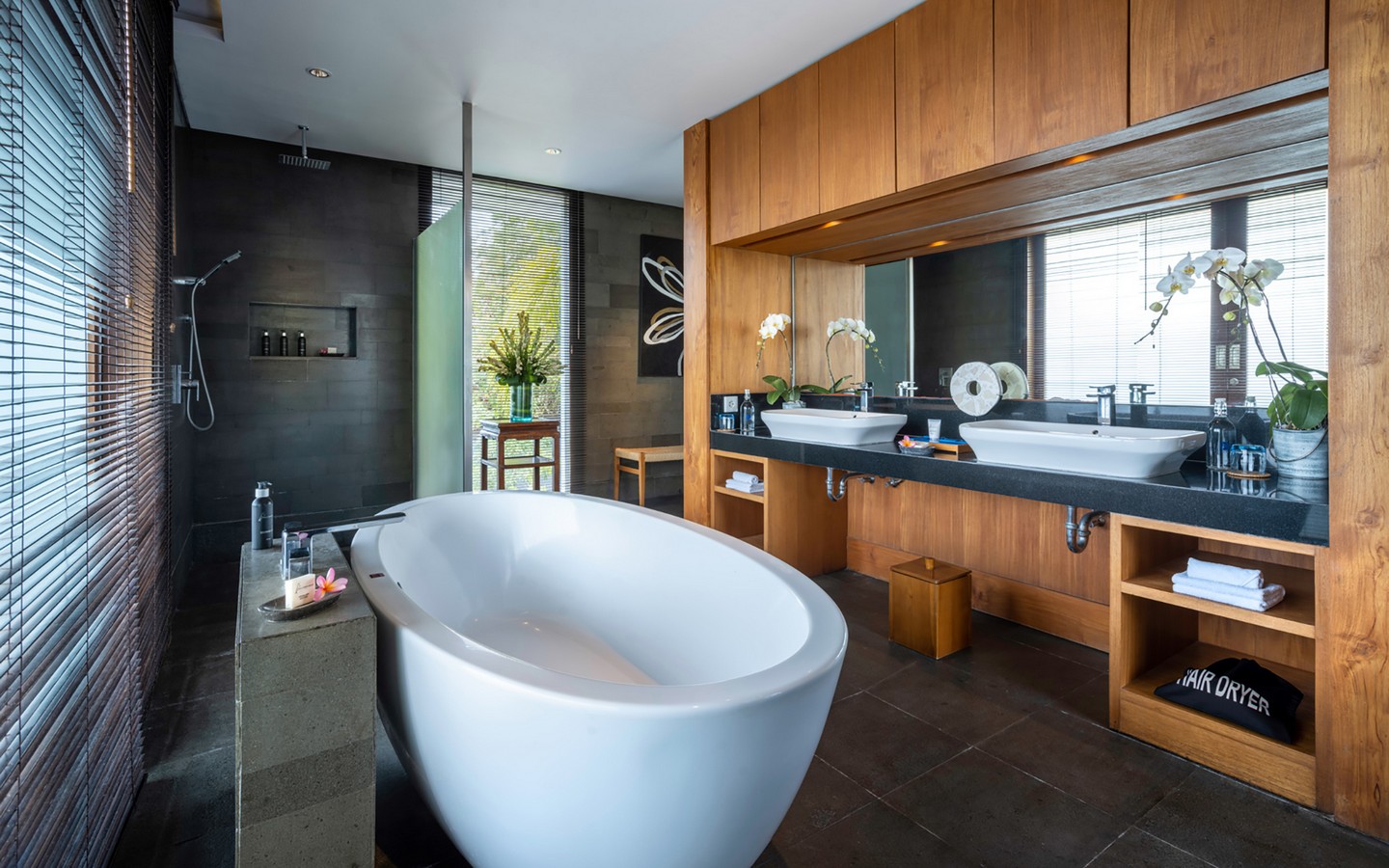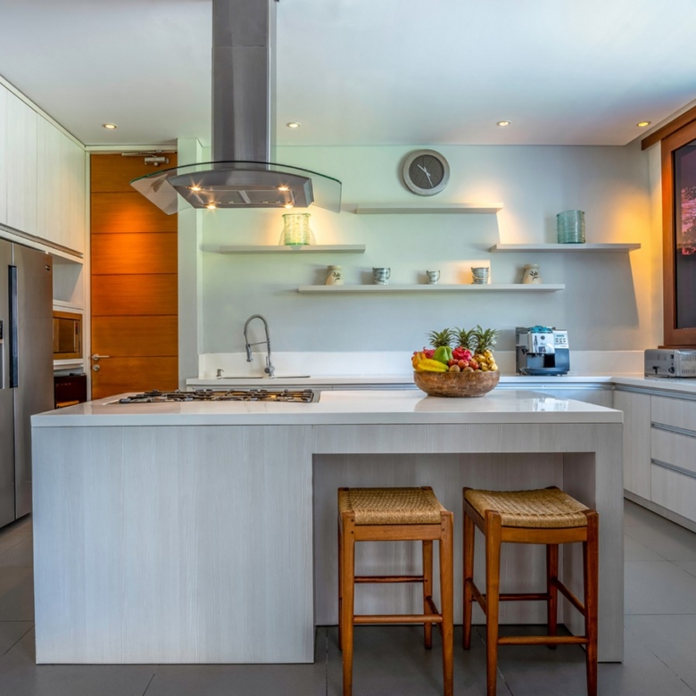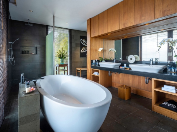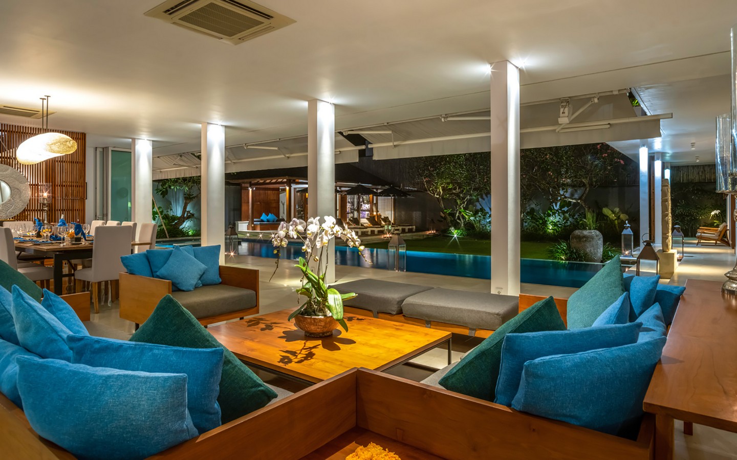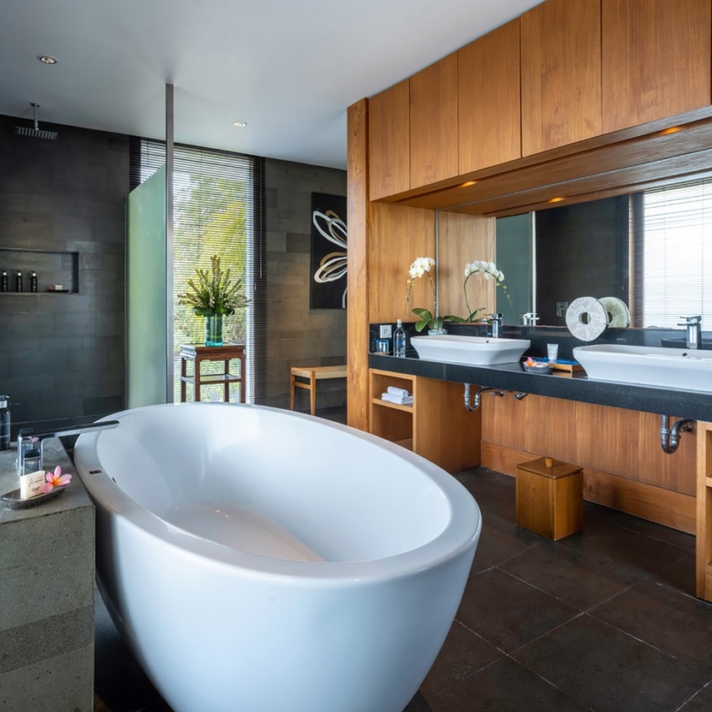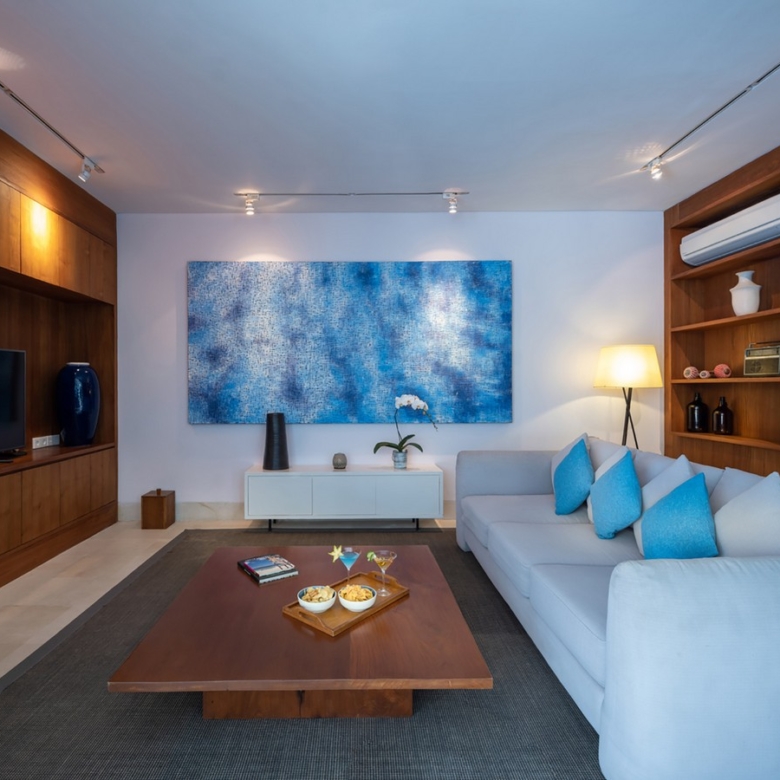 Built in 2012, the interiors are fresh with white walls and smooth creamy Palimanan stone floors, accented by warm honey-hued timber, modern impressionist artwork, richly textured furnishings and a smattering of Indonesian ethnic artefacts. Set on 900 sqm of land with a property size of 700 sqm over 2 levels, the villa has a spacious open plan living area with a grand dining table with views of the pool and pretty garden. There is also an entire area dedicated for staff and parking for 5 cars.