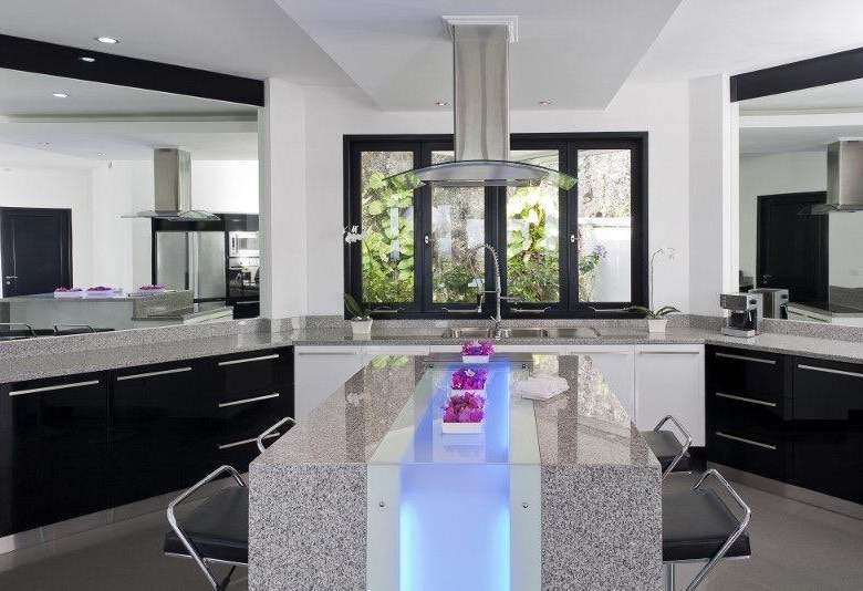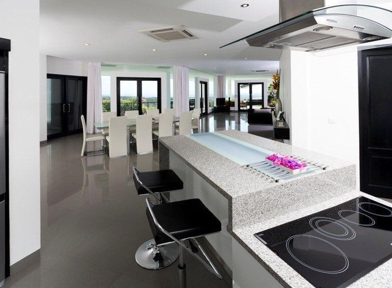 The villa features 5 large double bedrooms, each with its own luxurious bathroom and dressing area. The villa also boasts two dining rooms and three kitchens that are fully equipped. The outdoor areas of the villa with its patios and balconies are all designed to take in the incredible views. The property also has a pool house with a jacuzzi, kitchenette and bathroom. The staff quarters include 3 bedrooms, kitchen, living room, bathroom and a laundry room. The villa also has a spacious garage that can accommodate several vehicles.
