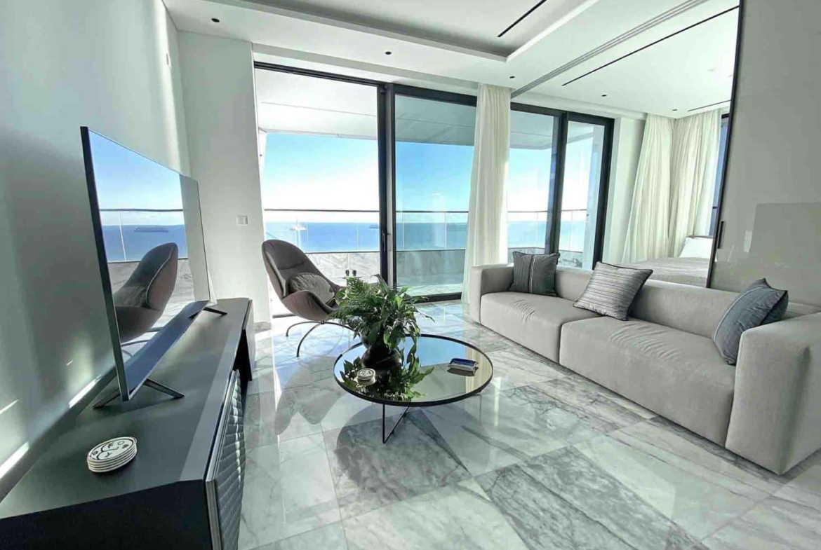 Luxury two bedroom apartment of an exclusive 21 floor residential building with exciting 5-star hotel facilities and services. Located in the centre of Limassol’s coastline in Cyprus. The building consists apartments all designed and positioned to offer breathtaking sea views of the Mediterranean Sea from all areas of the residences. This apartment enjoys the privilege of being on the corner of the 17th floor ensuring breathtaking sea and city view. Luxury furniture, electrical appliances, decorations and equipment are included in the price.