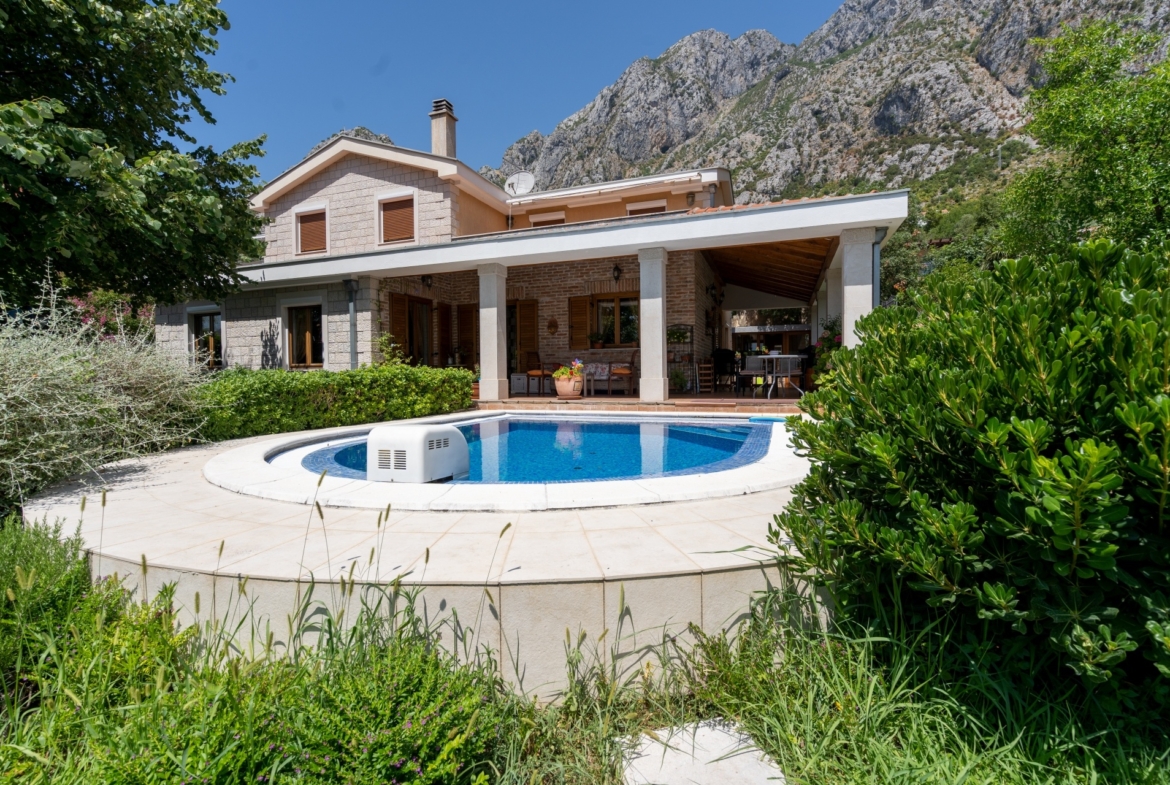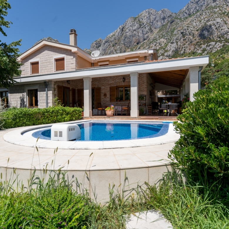 This family, warmly decorated house with an amazing sea view is located in Orahovac, only a 15 minutes drive from Kotor Old town. The plot measures an area of 670m2, with a beautiful green yard, swimming pool, and children’s playground.The house consists of 4 bedrooms, 4 bathrooms, a living area with a fireplace, two wardrobes, and a kitchen. Cozy terrace with barbeque place has a beautiful sea view.On the ground floor, there is an open plan living area, kitchen, two bedrooms, and two bathrooms. The living room is furnished in a warm family way, with fireplace and art paintings on the walls. The kitchen is fully equipped, with a wooden kitchen and dining elements.The first floor consists of one bedroom, one bathroom, and a large terrace with a spectacular sea viewThere is one additional apartment on the first floor, with one bedroom, bathroom, living room, and kitchen, that can be used as a guest apartment.The house comes fully furnished, and it is air-conditioned. The finishing materials are of high quality – Italian ceramic tile and natural ash parquet with internal pine overlaps. There is floor heating in each bathroom.The house is just 2 minutes drive from the restaurant and beach bar.House is situated in a quiet and peaceful neighborhood, 8km from Kotor Old town and 20km from the Porto Montenegro marina.