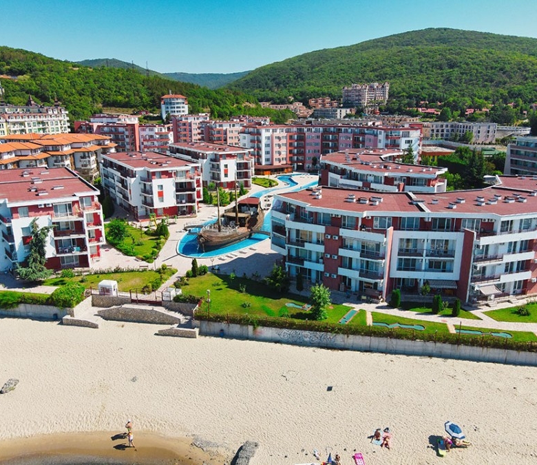 First sea line! 1 BED apartment, 70 sq.m., in Privilege Fort, Elenite Resort! We are offering for sale 1 BED apartment located on the sea shore in one of the most picturesque summer resorts on the Bulgarian Black Sea coast – Elenite. It is located in the popular holiday complex called Privilege Fort Beach. The complex is situated on first line to the sea in Elenite, on the beach, in the spectacular calm southern bay with the famous beach called Robinson. The complex begins from the beach itself and ends in a pine forest, offering an extremely rare and healthy combination of sea and mountain climate. The complex has all the facilities you would need – restaurants, cafes, food centers, mini-market, swimming pools with water attractions, childrens pool, childrens playgrounds, cosmetic and medical center, fitness club, sauna, tennis court / football field, parking. The apartment offered for sale is located on second floor and has an area of 70 sq.m. It comprises of: – entrance hallway; – kitchen with living-room; -one bedroom; – Bathroom and toilet; – Big terrace with views to the gardens; The apartment is fully furnished and equipped with all the necessary facilities for a good vacation or renting out. Laminate flooring, tiled flooring and PVC window frames are available in the property. Additionally, the area provides the following amenities for a pleasant and comfortable living and entertainment: a cafe and a food market. It is also worth-mentioning that there is no heavy industry in a close proximity. Privilege Fort has all the facilities you would need – restaurants, cafes, food centers, mini-market, swimming pools with water attractions, childrens pool, childrens playgrounds, cosmetic and medical center, fitness club, sauna, tennis court / football field, parking. Annual maintenance fee – 14.5 EUR/sq.m.