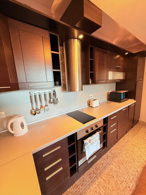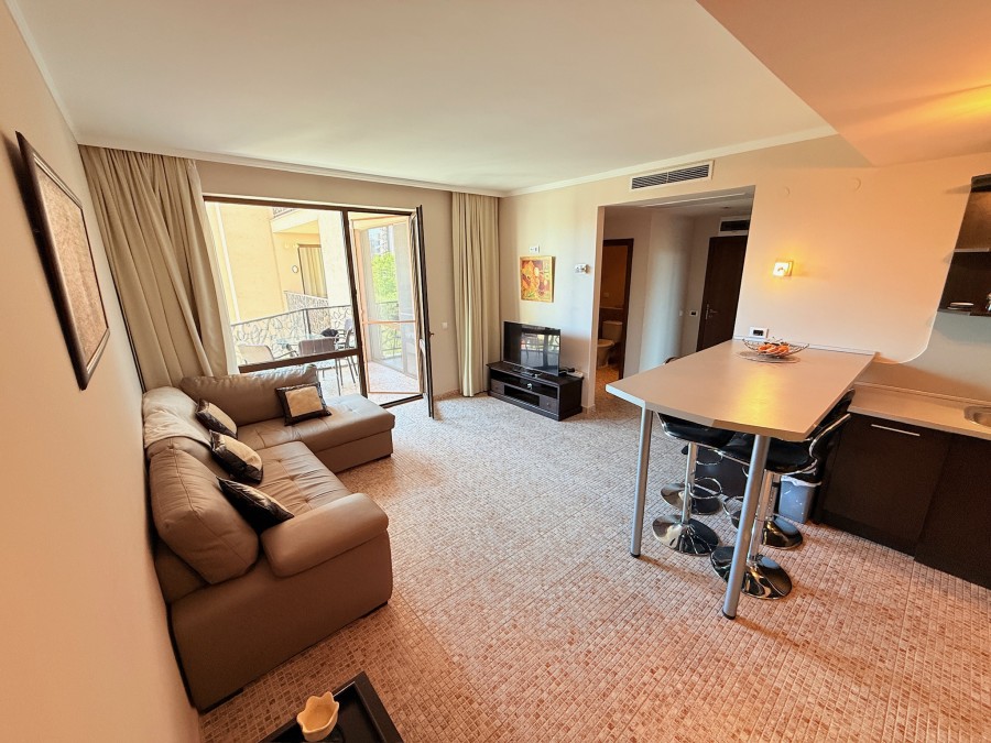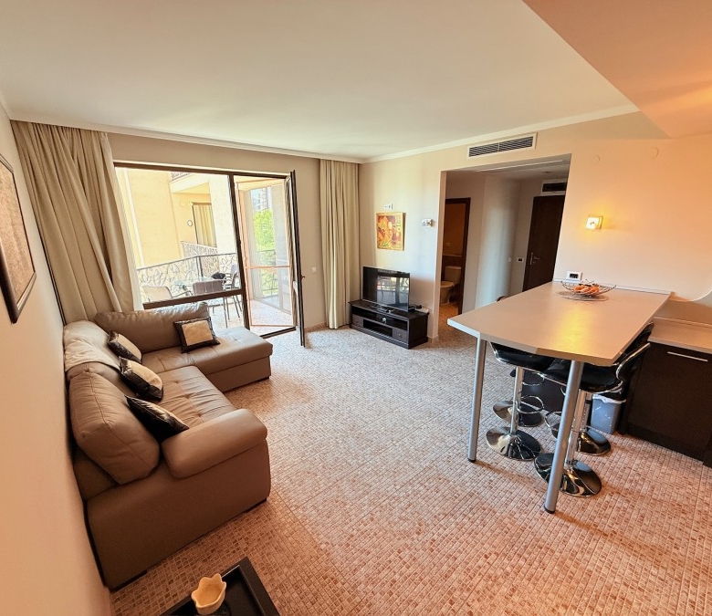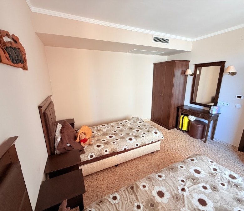First sea line! 2 BED apartment, 99 sq.m., in Barcelo Royal Beach, Sunny beach 2 BED spacious apartment is offered for sale in the “Royal Beach Barcelo” complex, Sunny Beach The complex is distinguished by its excellent location – almost in the center of the resort town of Sunny Beach and in close proximity to the city beach. There is an extensive infrastructure around the complex with restaurants, shops, pharmacies, etc. On the territory of the complex itself there are several swimming pools, a spa center, a restaurant, a bar, a childrens club, a childrens playground, underground parking, car rental, a currency exchange, and an ATM. The apartment has a total area of 99 sq.m., is located on the fourth floor and consists of: an entrance hall, a living room with a kitchen block and a dining area, two bedrooms, bathroom, two terraces overlooking the pool and gardens of the hotel. The apartment is furnished, equipped with appliances and ready to move in. Annual maintenance fee – 22 euros per sq.m. Beach – 50 m