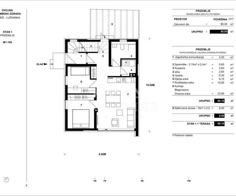 – dječja soba : 8,15 m2 x 1,0 = 8,15 m2 (neto)