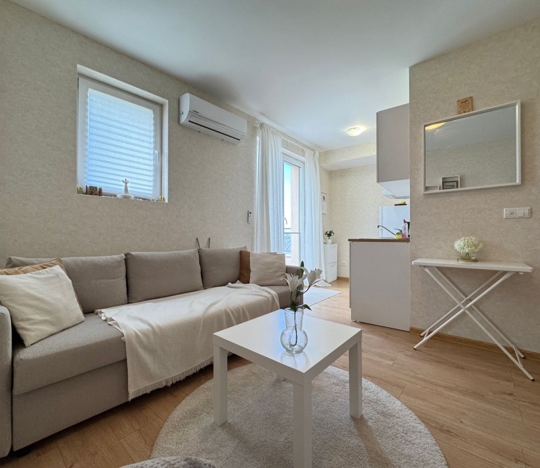 Fully furnished studio, 30 sq.m., in the newly built Aphrodite Park, Sunny beach Cozy studio apartment of 30.6 sq m Located on the 4th floor Apartment layout: – Living room with kitchen – 1 bathroom with shower – 1 balcony – Maintenance fee: €14/m2 per year The Aphrodite Park complex consists of two separate buildings located opposite each other. The area where the Aphrodite complexes are located and where the new Aphrodite Park has been built is quiet and green. The already developed parkland (approximately 7 hectares) includes playgrounds, recreation areas, outdoor fitness, sports fields, and quiet, traffic-free streets. Here you can stroll in the fresh air, and children can play safely while you enjoy a coffee in pleasant company. Year of construction – 2022. For the convenience of residents, there is a swimming pool with a childrens area, a playground, a restaurant, and video surveillance. Distance to the beach: 700 m. Act 16.