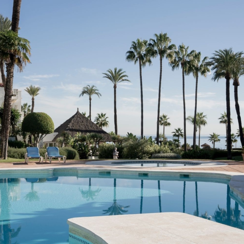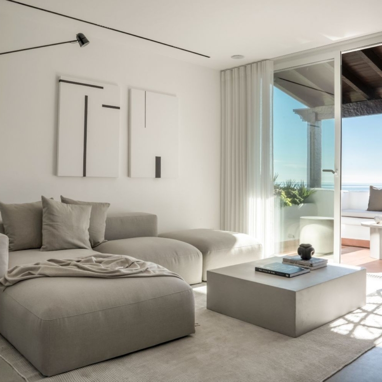 This fantastic luxury penthouse is located in one of the most beautiful frontline beach developments of the Costa Del Sol, an oasis of tranquility yet within walking distance to shops and restaurants and the charming Old Town of Estepona. The apartment itself has been fully renovated to the highest standards and it features an open-plan layout, 2 bedrooms with fitted wardrobes and 2 bathrooms en-suite with underfloor heating, plus a guest toilet. The kitchen is separated from the living area by a custom designed wooden panel which features a rotating flat screen TV. Thanks to its southwest orientation and large glass windows, the penthouse is very bright and offers breathtaking sea views from both levels. On the upper floor you can enjoy a spacious rooftop terrace with a fully equipped outdoor kitchen, BBQ, 2 outdoor showers, covered dining area and a sun lounge. This prestigious residential complex features direct access to the beach and promenade, 7 swimming pools of which one is heated, award winning tropical gardens, 3 restaurants, a gym, 24hrs security, 3 padel courts, 5 tennis courts and a small football pitch. This resort is an ideal holiday destination indeed! Great access to to the main road joining Estepona and Marbella.