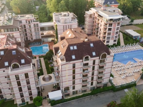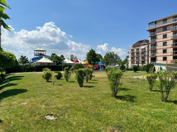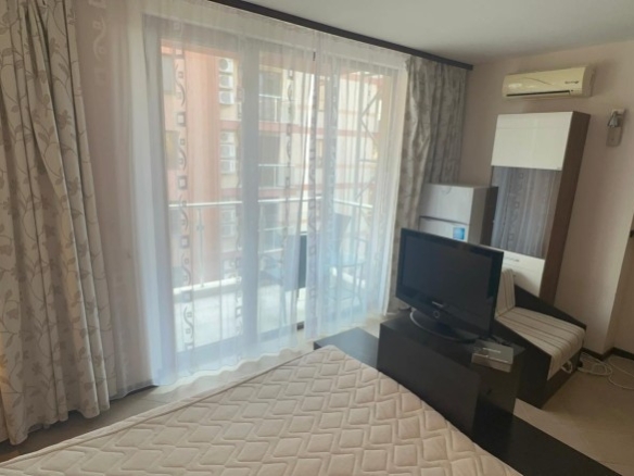The property is part of recently built apart-complex Tarsis (2013) in the most green and quiet part of Sunny beach resort. Distance to the beach is less than 10 min walking. The complex has 2 swimming-pools, relaxing zone around the pool, landscaped garden, children’s playground, Spa center, gym, restaurant, pool bar, piano bar, beauty studio. The garden surrounds the whole complex and is a place where you can chill out and have a drink in the hot summer days. The apartment which is offered for sale is situated on the2nd floor and has a total area of 40 sq.m. It is offered fully furnished and excellent for renting out. The apartment offers: – one big room that combines kitchen with bedroom and sitting area; – BathroomWC- with washing machine; – Blacony with garden views The apartment is suitable for holiday rentals. The complex is one of the most preferred places for vacation in Sunny beach. Annual maintenance fee – 12.5 EUR/sq.m.