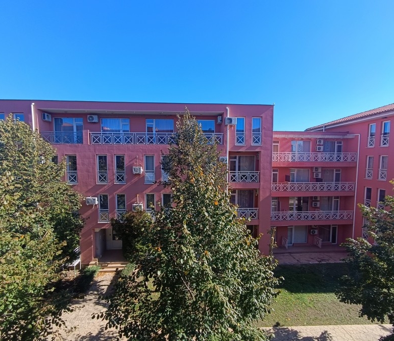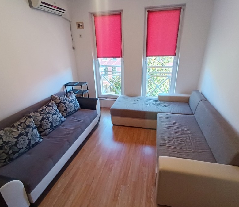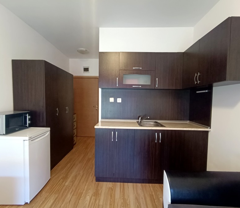 Furnished studio, 25 sq.m., in Sunny Day 6, 3 km from Sunny beach KC Properties is pleased to offer you this nicely furnished studio apartment situated in the outskirts of Bulgarian biggest resort – Sunny beach. The property is part of Sunny day 6 – a holiday village with 6 outdoor pools, restaurant, supermarket, pool-bar, tennis courts, sport fields, gated parking, reception, video surveillance and 24/7 security. The complex is located 3 km to the sea coast, 7 km to Nessebar town and 34 km to the nearest International airport in Bourgas. The studio is situated on the 2nd floor and is offered fully furnished and ready to use. Furniture includes: – Equipped kitchen with fridge, microwave and all small utensils; – 2 sofa-beds; – Cabinets; – Air-condition The bathroom is fully finished with shower, wash basin, toilet, electric boiler. No balcony. Annual maintenance fee – 580 EUR The studio is suitable for holiday rentals and for permanent stay.