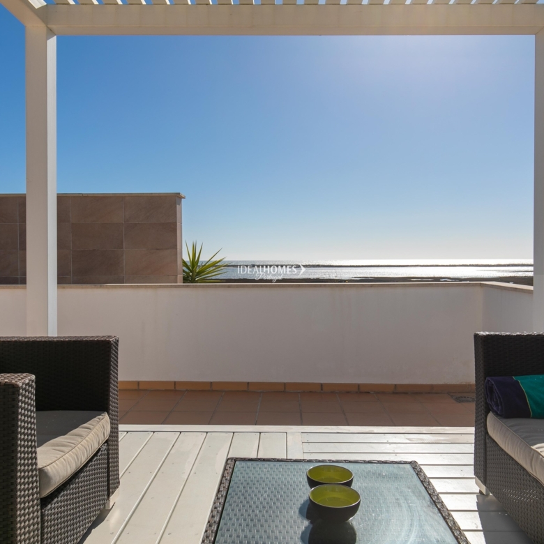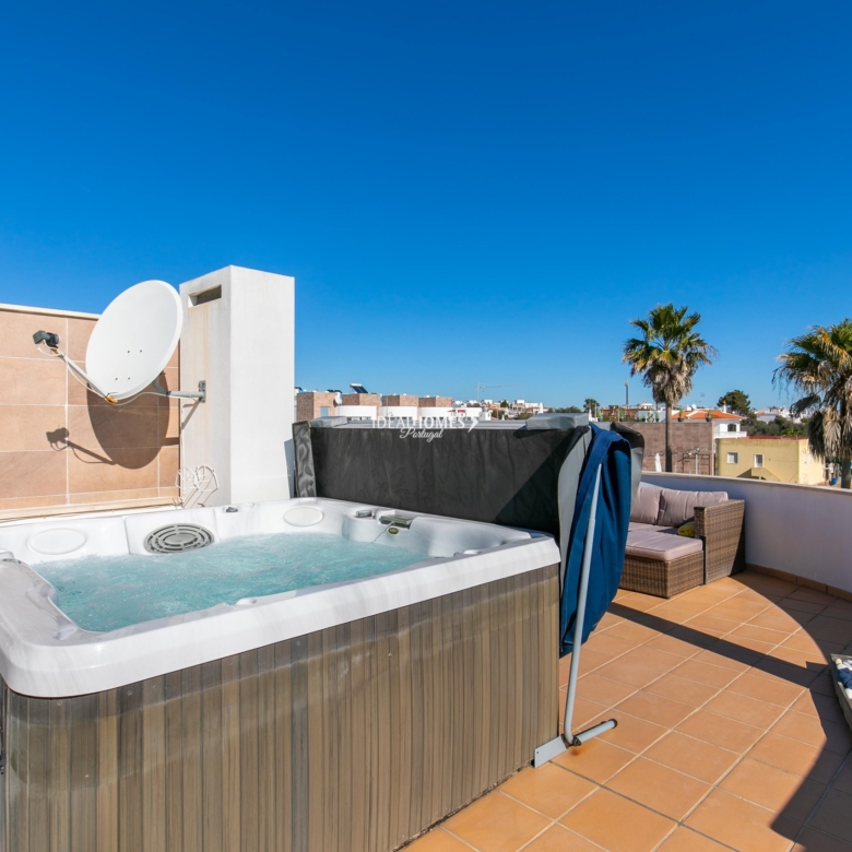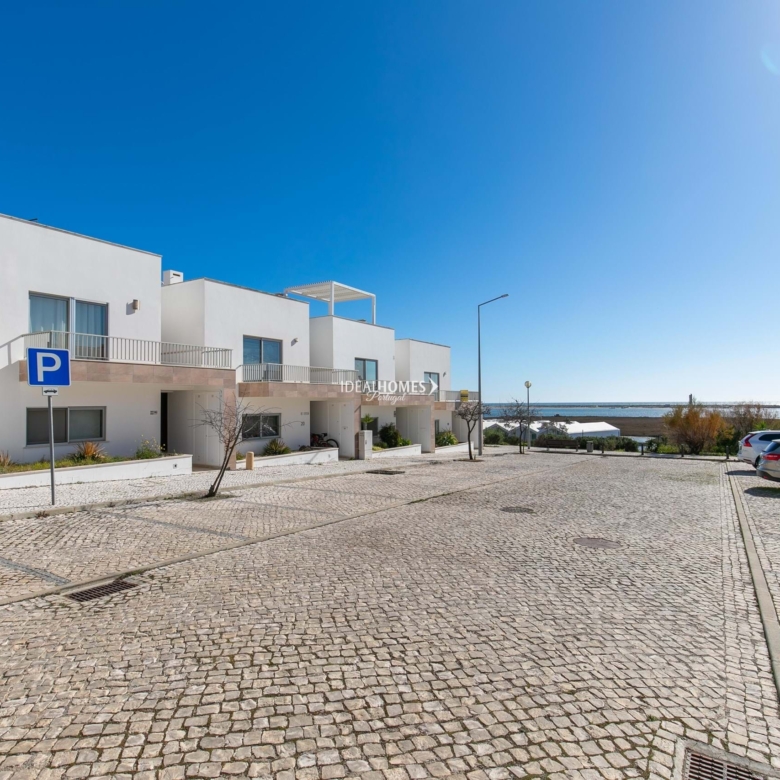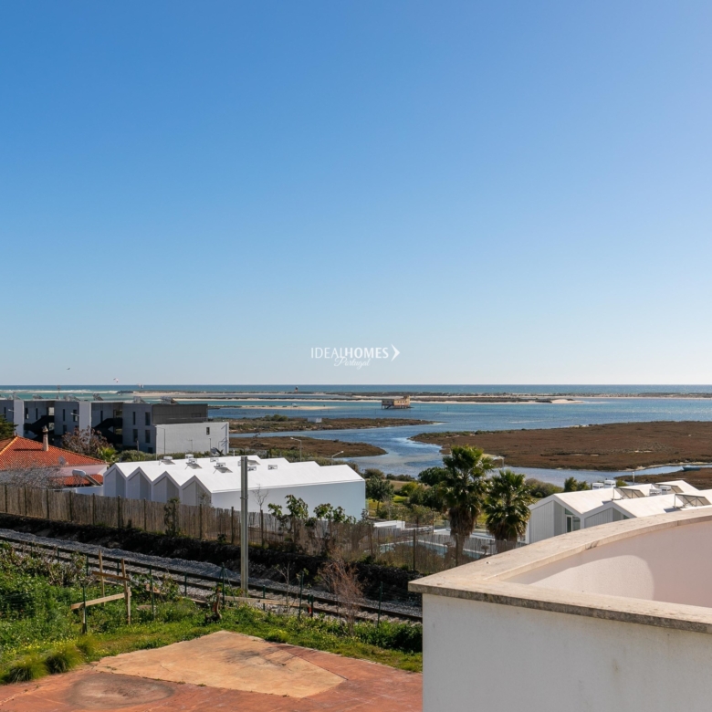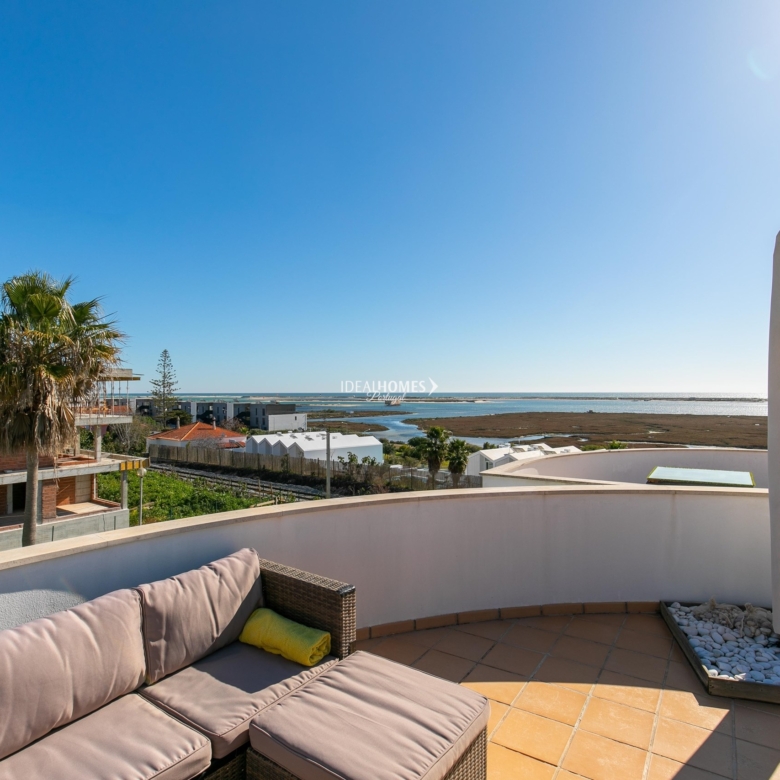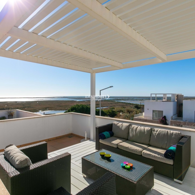 Featuring stunning sea views, this three bedroom townhouse is located in a modern development in Fuseta, within walking distance to the beach. On the ground floor, an open-plan living room leads round to the dining area and fully fitted kitchen. There are large sliding glass doors heading out from this space on to a terrace with amazing sea views, where there is a second dining area and a small well maintained garden. In addition to this, one of the three large bedrooms is also on the level along with a bathroom. This bedroom is currently being used as an office. Upstairs, there are two bedrooms: the master bedroom has an en-suite bathroom and panoramic glass windows by the bed, giving the privilege of waking up to beautiful sea views. The en-suite bathroom has the benefit of being equipped with a bathtub separate from the walk-in shower. The second bedroom also has an en-suite bathroom and a private balcony facing a different angle of the Ria Formosa and Armona’s island. The stairs on this balcony lead up to a large roof terrace with a private Jacuzzi, a pergola and extra lounge spaces to comfortably enjoy the impressive 180-degree views of Fuseta and Armona’s beaches. Next door, there’s a communal swimming pool which is accessible by paying a small daily or monthly fee, and it comes with an amazing local restaurant with a rooftop that offers meals, tapas, snacks and drinks, all accompanied by incredible sea views. Comments from the Owner: ’Living here has been the highlight of our lives, with Ria Formosa being the backdrop to our daily lives. Waking up to natural, stunning and ever-changing views from sunrise to sunset, you can watch it all: the flamingos, the sandbanks, the colourful paragliding, etc. In addition, we have been so grateful to be able to access fresh produce daily due to the closeness to the village and begin or end the day on the rooftop where we have enjoyed the jacuzzi under the sunshine or the stars.’ Additional features include: air-conditioning throughout, heating, fitted wardrobes, built-in fridge in the kitchen, double glazed windows and extra storage space. About Fuseta: Fuseta is a tranquil fishing village, and this townhouse is situated only a short five minute walking distance from its centre, which offers all necessary amenities, such as local markets, restaurants, bars, cafes and also the train station. Fuseta’s beach is only a 15 minute walk away and the city centres of Faro, Olhao and Tavira are only a 30 minute driving distance from the property. Property ID: IDH33027 Price: €550,000 Property Size: 150.00 m2 Land Area: 140.00 m2 Bedrooms: 3 Bathrooms: 3 Property Type: Townhouse Property Status: For Sale