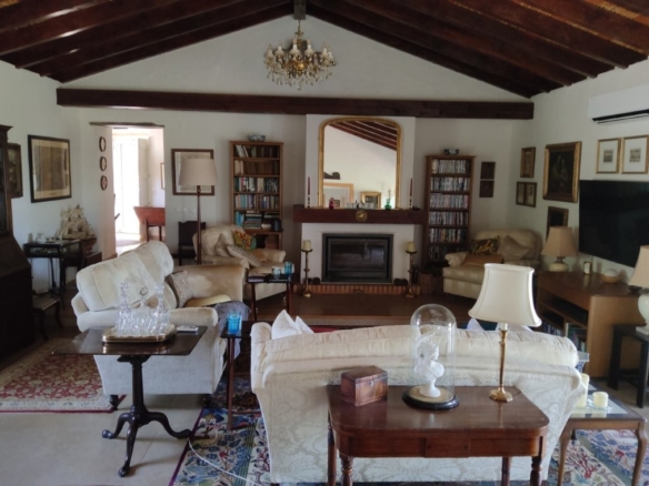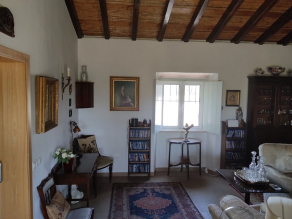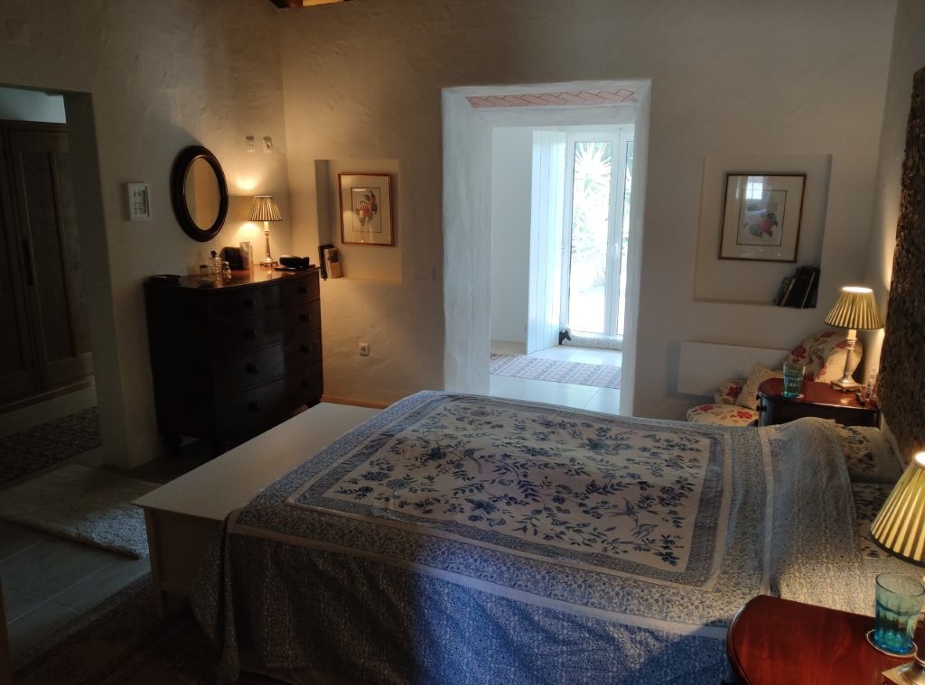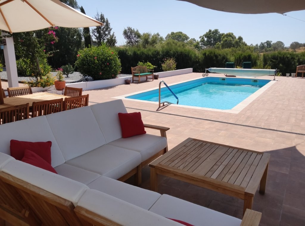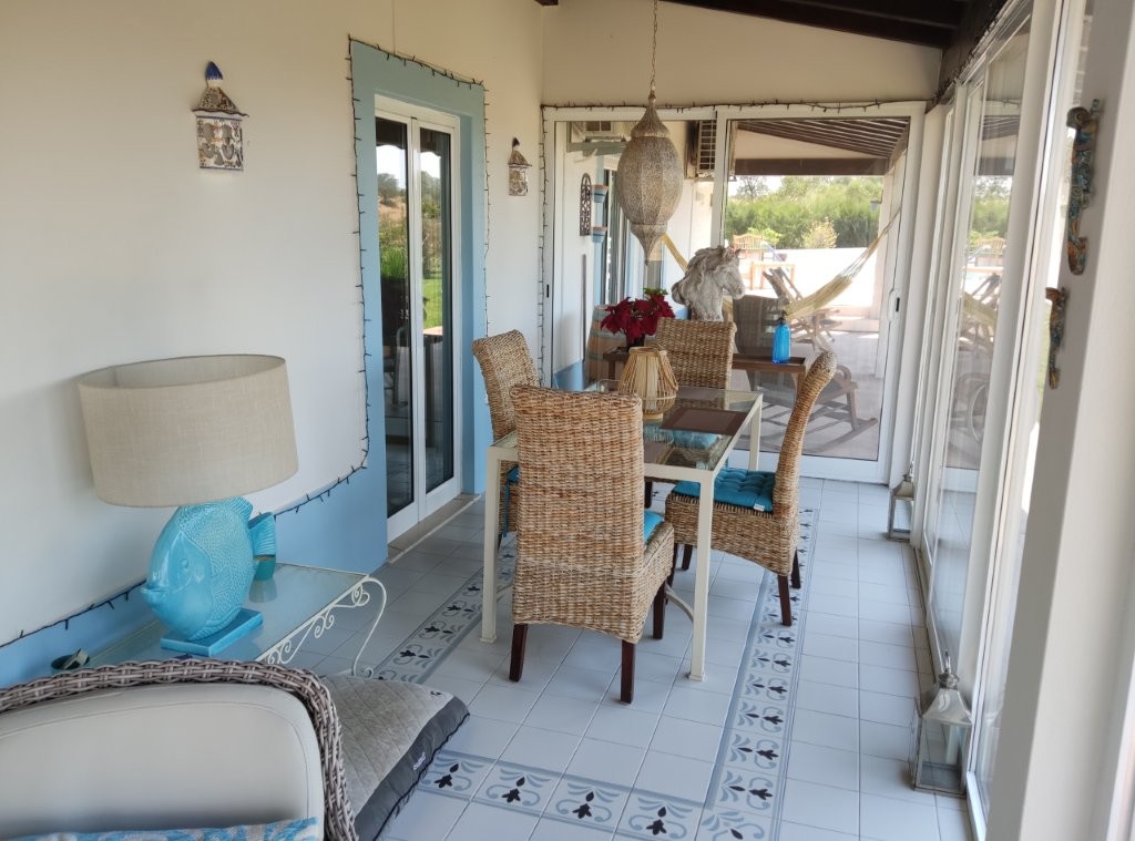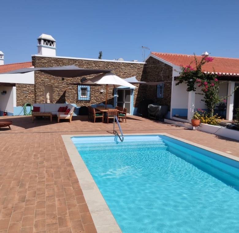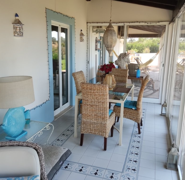 The main house, a sprawling 317-square-meter residence, is a masterpiece of design and comfort. The large lounge features a traditional Portuguese vaulted ceiling, creating a sense of grandeur and space. A cozy wood-burner fire and hot/cold air conditioning ensure comfort in any season. Two double-glazed patio doors with internal shutters lead out onto a covered terrace, seamlessly blending indoor and outdoor living.