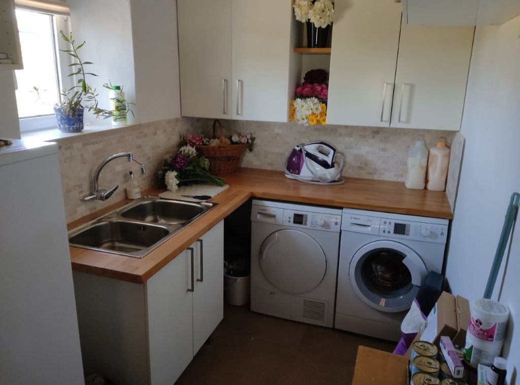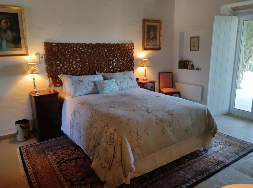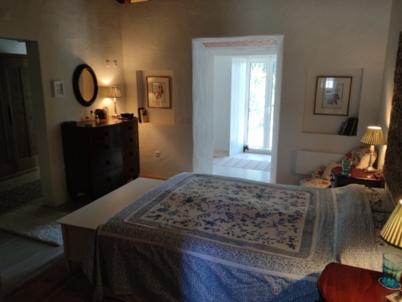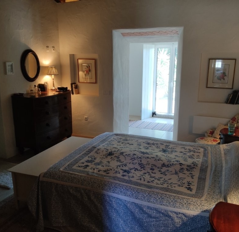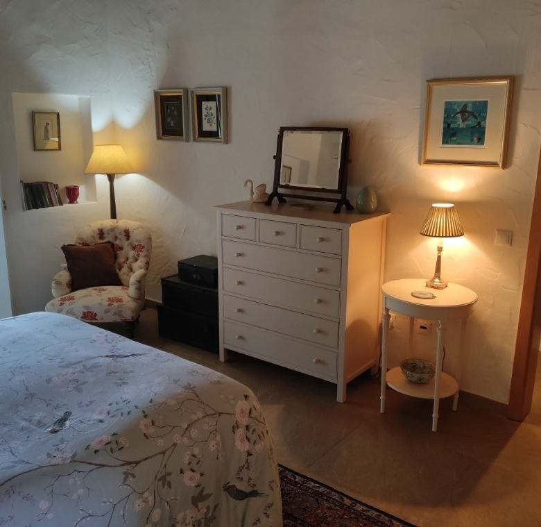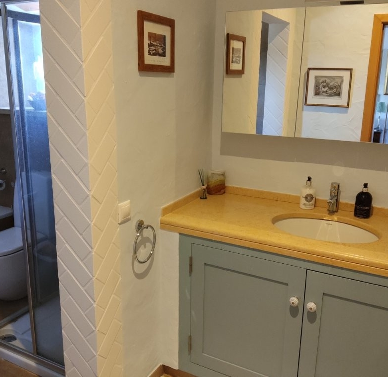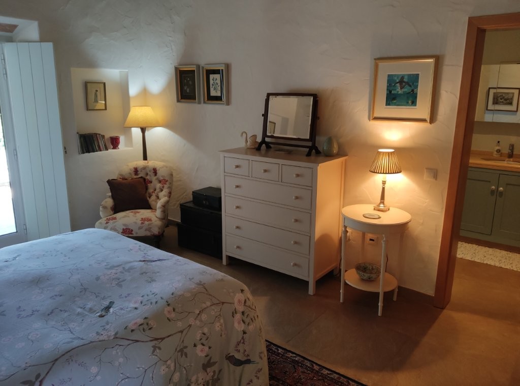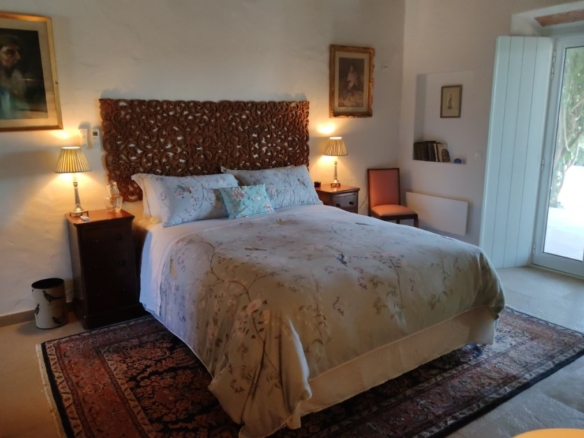 The newly refurbished kitchen and dining room is a chef’s dream, with its stunning Oxford blue doors and wooden worktops. A large ceramic double butler sink and a versatile hob with both ceramic gas and induction rings provide everything you need for culinary excellence. The kitchen opens into a beautiful orangery, a bright and airy space with a lounging area and off-white and blue floor tiles. The main house also includes a large pantry, a laundry room, and a small bathroom.