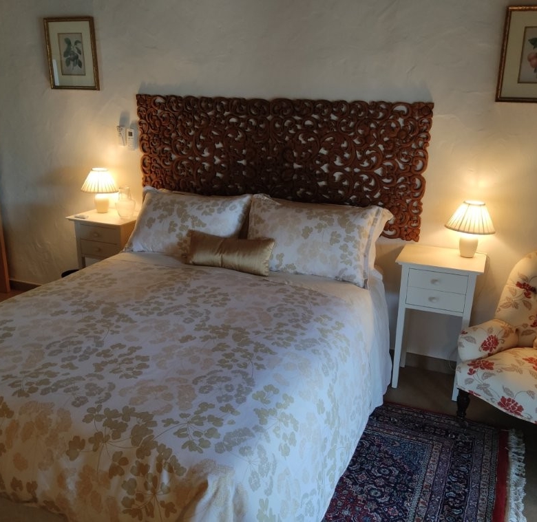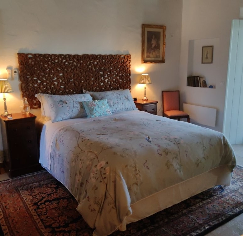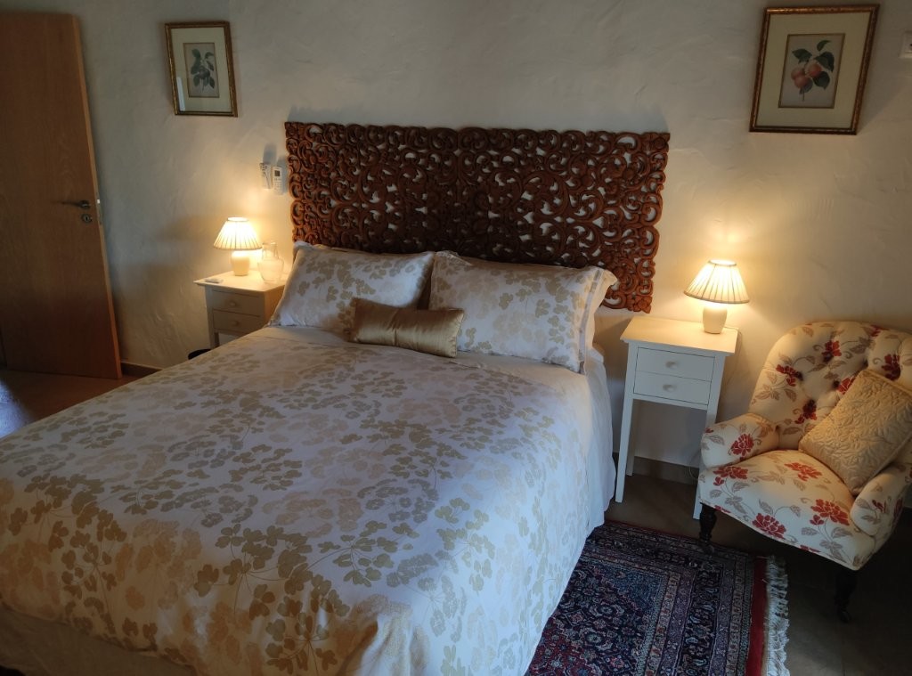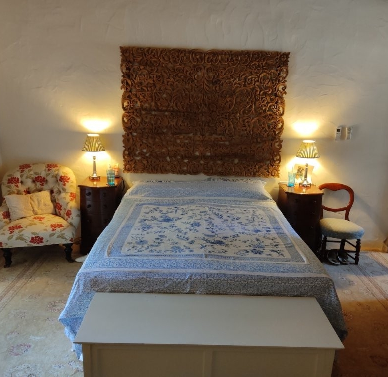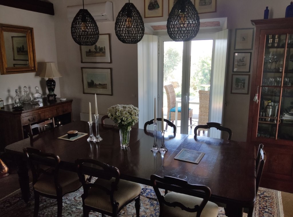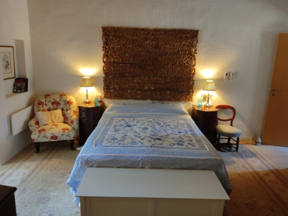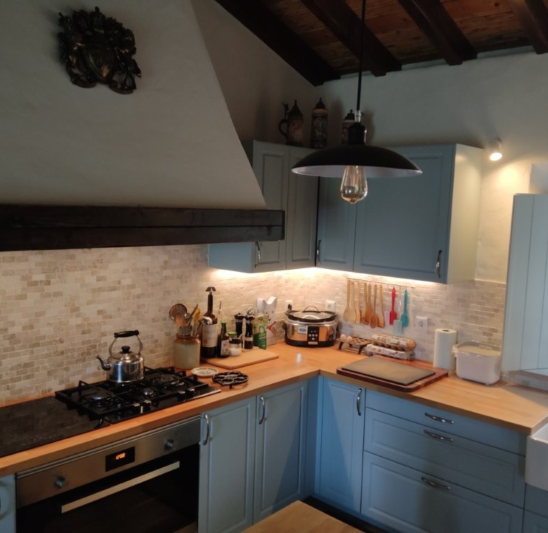 The newly refurbished kitchen and dining room is a chef’s dream, with its stunning Oxford blue doors and wooden worktops. A large ceramic double butler sink and a versatile hob with both ceramic gas and induction rings provide everything you need for culinary excellence. The kitchen opens into a beautiful orangery, a bright and airy space with a lounging area and off-white and blue floor tiles. The main house also includes a large pantry, a laundry room, and a small bathroom.