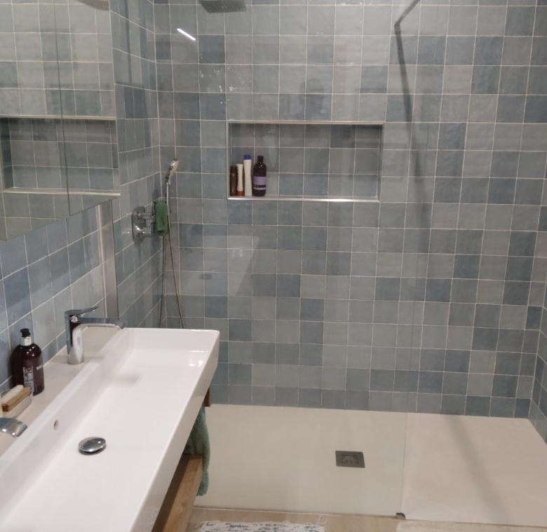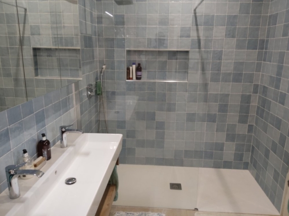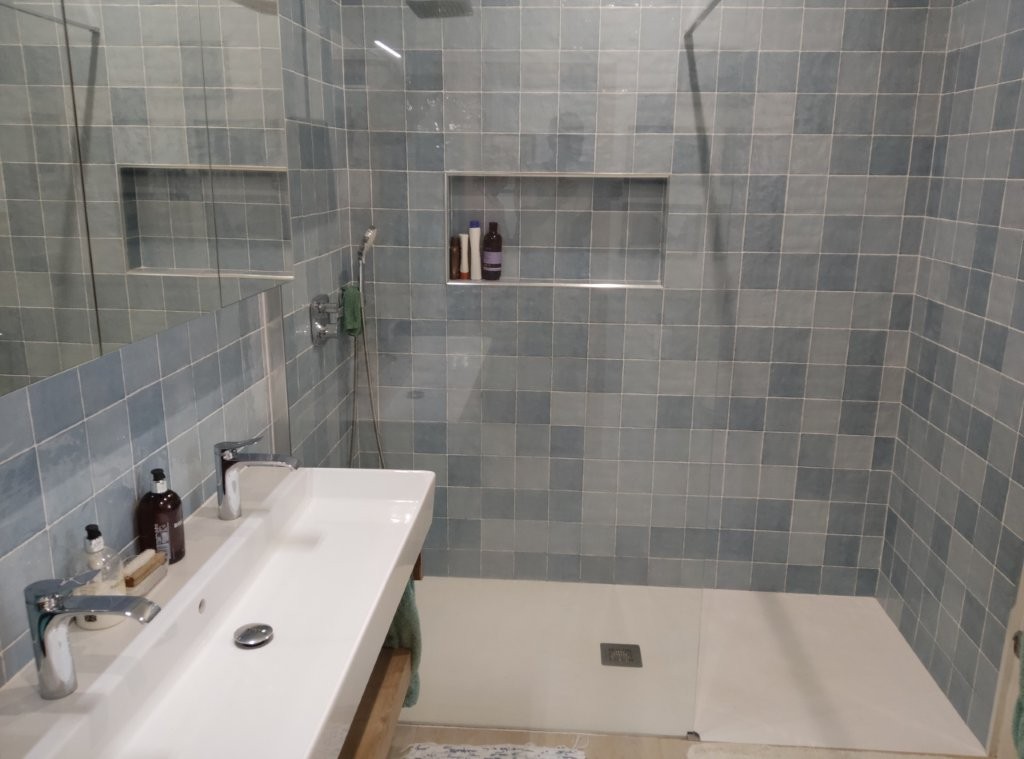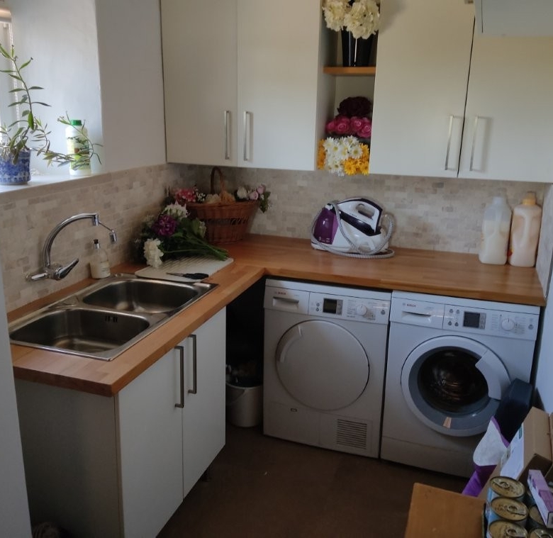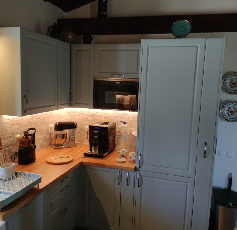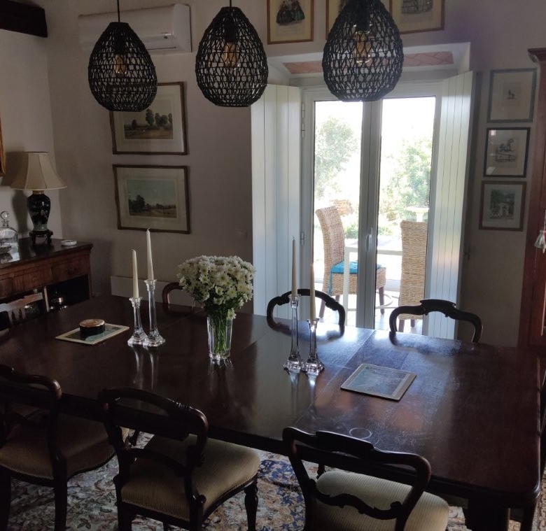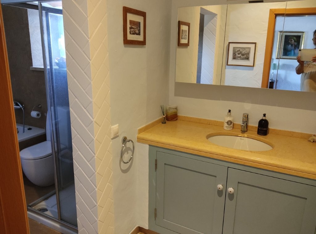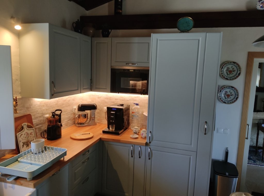 The newly refurbished kitchen and dining room is a chef’s dream, with its stunning Oxford blue doors and wooden worktops. A large ceramic double butler sink and a versatile hob with both ceramic gas and induction rings provide everything you need for culinary excellence. The kitchen opens into a beautiful orangery, a bright and airy space with a lounging area and off-white and blue floor tiles. The main house also includes a large pantry, a laundry room, and a small bathroom.