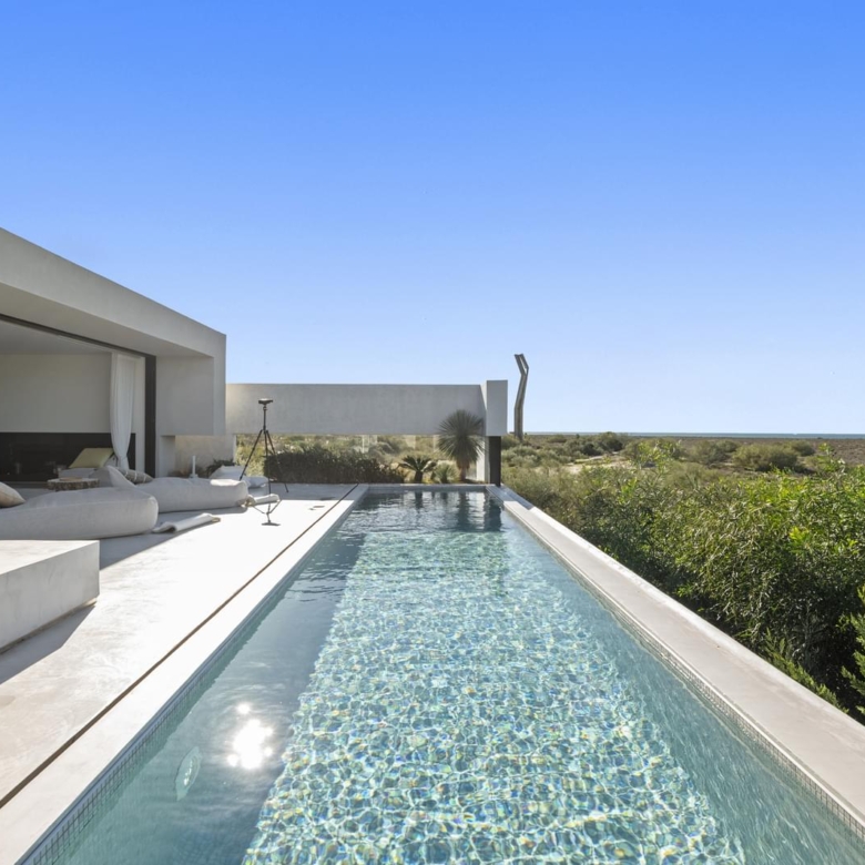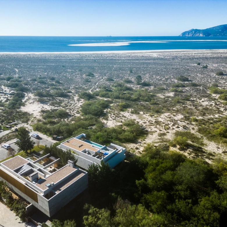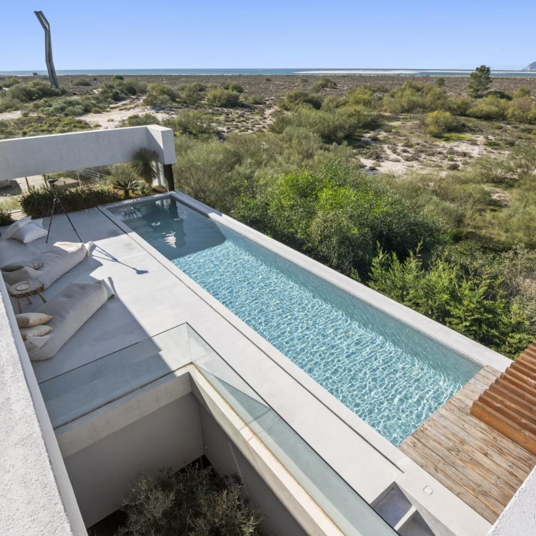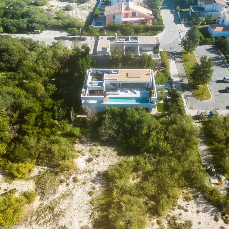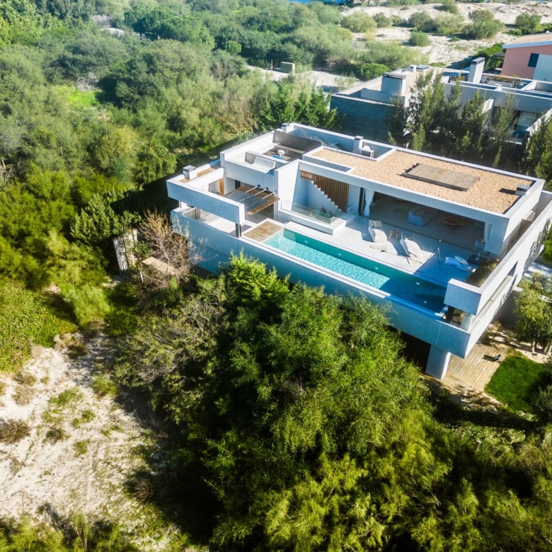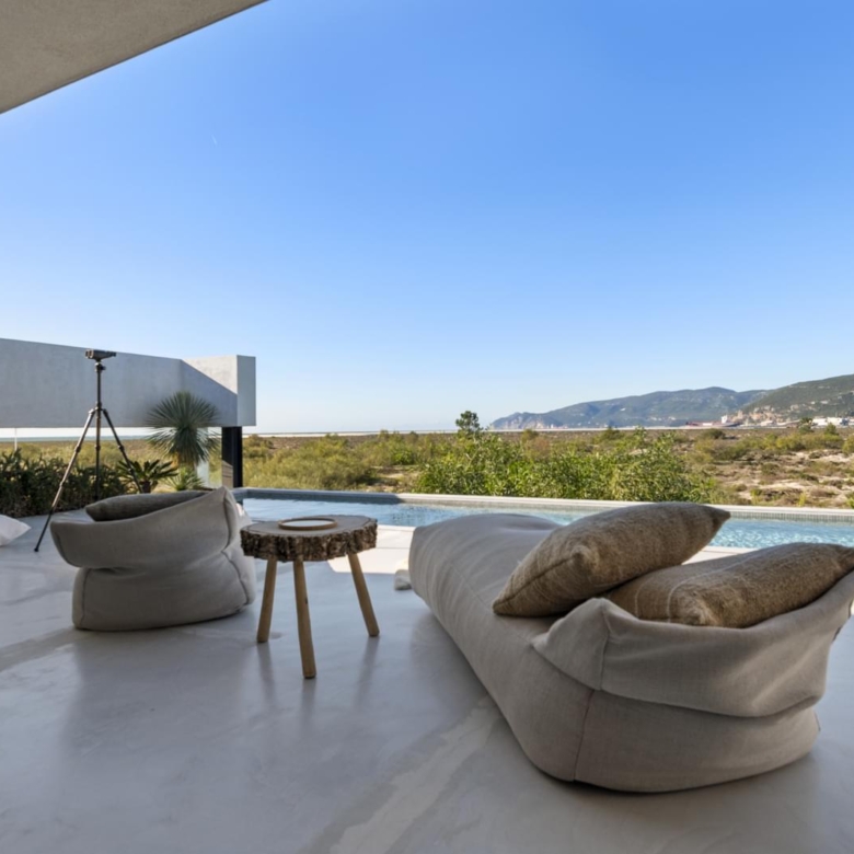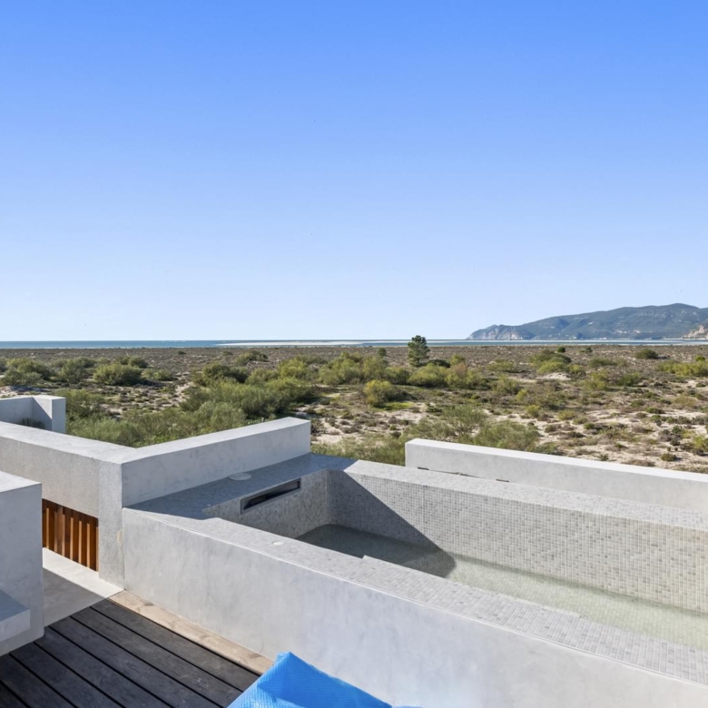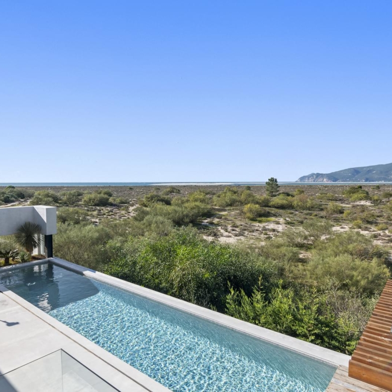 If you are looking for a home that is a true masterpiece of modern design in Portugal, this is your opportunity. This fantastic villa of modern lines stands out for its unique characteristics: wide and open spaces with a unique location, in the first line of the beach, with the dunes as landscape. The construction of this house is an example of rigor and excellence. Every detail has been carefully thought out and executed by our highly skilled builder. The solidity of the infrastructures is a priority, ensuring a perfect settlement even on sandy land, while the privacy of the residents was meticulously considered. The materials used follow the same quality standard. The highest quality microcement covers the entire exterior of the house, providing a contemporary and elegant look. The doors and windows are made of safety glass and natural wood, adding a harmonious aesthetic touch. On the ground floor, there are 4 bedrooms, all en-suite, each one with generous dimensions and bathrooms well connected with the exterior. The ‘Master bedroom’ is a real highlight, with 20 sqm and a luxurious bathroom with a steam sauna and a generous jacuzzi, perfect for relaxing. In addition, the space is complemented by ample storage areas and an interior garden that houses an olive tree with more than 2 thousand years, a living testimony of history. On this level you will also find the laundry area and the swimming pool’s engine room, ensuring convenience in all aspects. The icing on the cake is the first floor, where the house reveals its true value. Here, you will enjoy a panoramic view of more than 180 degrees, overlooking the dunes, the sea, the Arrabida’s mountain and the stunning mouth of the Sado River. The first floor is dedicated to your well-being. A swimming pool with 12 meters long and 2 meters wide offers an incredible view, making it the focal point of this floor. On this floor you have access to the terrace with a jacuzzi and a meditation area. The location ensures that it has a surrounding of pure dunes and vegetation, without nearby buildings to disturb your serenity. The villa also offers a surprisingly large dimensioned underground space, which comprises a bedroom, a cinema room, a games’ room and a bar. Luminosity is guaranteed by the openings for the interior gardens and a perfectly planned light installation. This is where everything happens in an open space, a real audience for the dune and maritime environment. The visual pollution is miles away, just across the mouth of the Sado River. Do not miss the opportunity to call home to this masterpiece. Come live the unique experience that this House in Troia Villas Mar has to offer. Your escape by the sea is waiting! Porta da Frente Christie’s is a real estate agency that has been operating in the market for more than two decades. Its focus lays on the highest quality houses and developments, not only in the selling market, but also in the renting market. The company was elected by the prestigious brand to represent Portugal, in the areas of Lisbon, Cascais, Oeiras, Sintra and Alentejo. The main purpose of Porta da Frente Christie’s is to offer a top-notch service to our customers. Property ID: PDF-PF31305 Price: €5,800,000 Property Size: 253.15 m2 Land Area: 555.0 m2 Bedrooms: 4 Bathrooms: 4