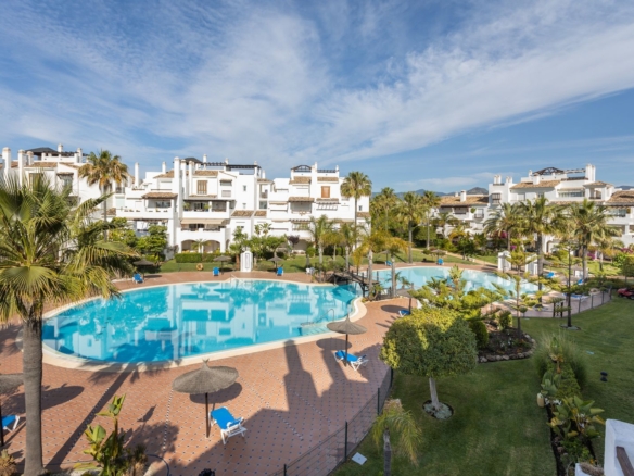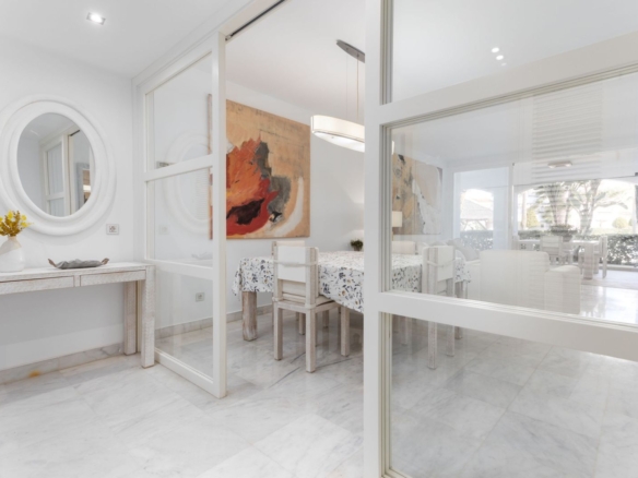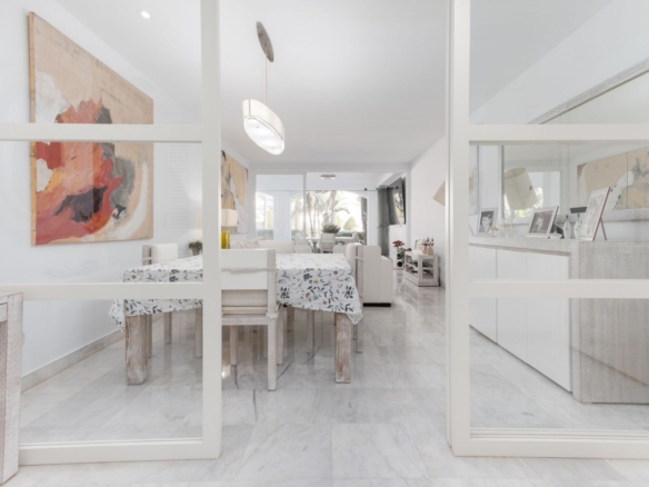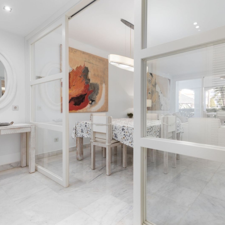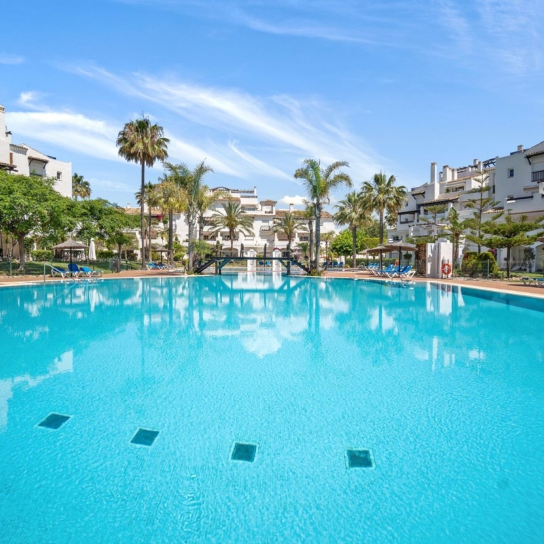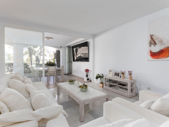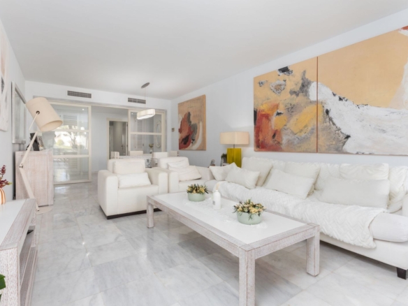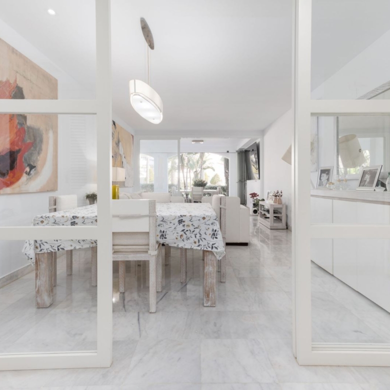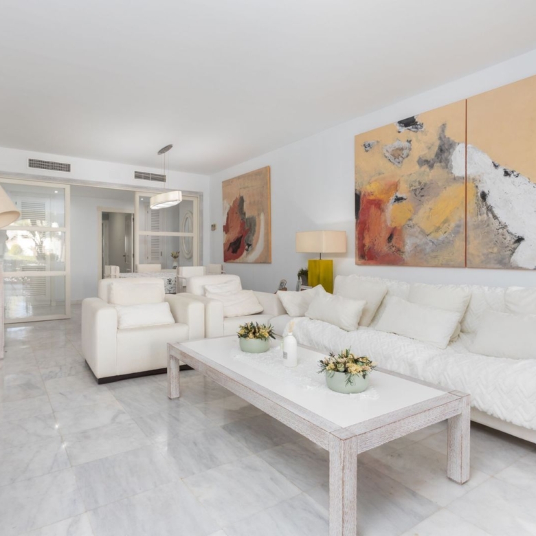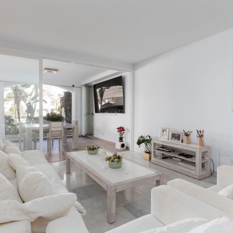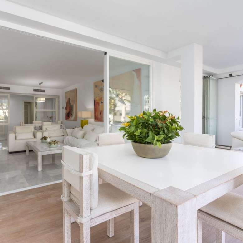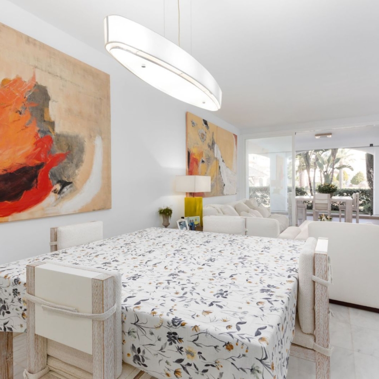 Discover luxury and comfort in this exclusive ground floor apartment in the prestigious urbanization of Las Adelfas!.Located on the seafront promenade of San Pedro de Alcantara, this spectacular apartment offers you the opportunity to live just a few steps from beach bars, restaurants and just 4 minutes from Puerto Banus.The gated community has 24-hour security, large gardens cared for in detail and two impressive lake-type communal swimming pools, ideal for enjoying the Mediterranean climate.This corner property is one of the largest in the urbanization, with 240 m2 built that are distributed in an elegant entrance hall, a spacious living-dining room, and a glazed terrace overlooking the garden and pool. The kitchen is fully equipped and renovated, and the five bedrooms offer maximum comfort, highlighting three en-suite bedrooms, two of them with direct access to the main terrace.in addition, it has two parking spaces and a storage room with direct access by elevator.Built in 2003, this well-maintained apartment is ideal for families or as an investment. With adapted access for people with reduced mobility, electric heating and air conditioning, this home offers all modern comforts.Don’t miss the opportunity to live in an exclusive environment with all the facilities at your fingertips. Come and see your new home in Las Adelfas!The kitchen and bathrooms are completly refurbished.