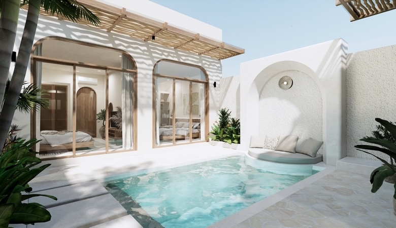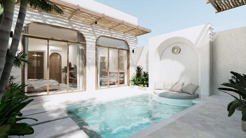 Each villa is thoughtfully designed with an open-plan living area that seamlessly connects to a private swimming pool, creating the perfect space for relaxation and entertaining. Both bedrooms are positioned on the ground floor, offering pool views and ensuite bathrooms equipped with luxurious bathtubs and rain showers. Upstairs, the rooftop terrace provides a versatile space for dining under the stars or enjoying panoramic sunset views.