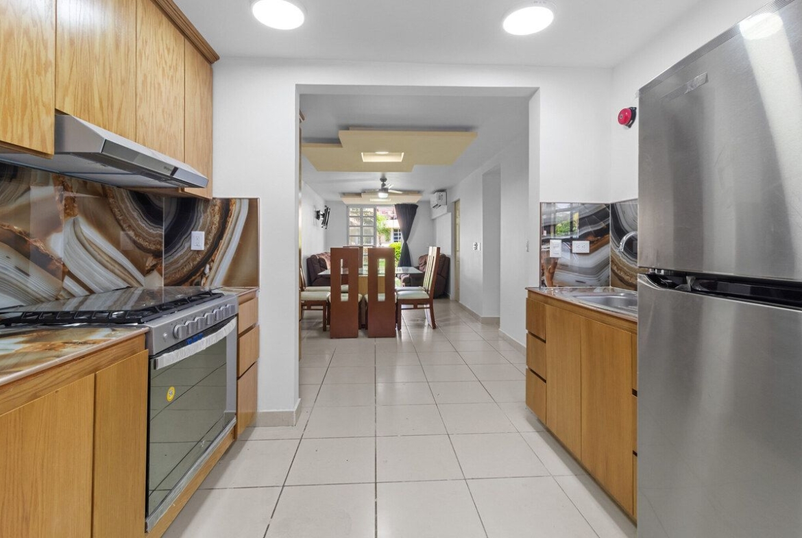 Discover your ideal home! Discover your ideal home! House furnished with everything you need: garage, ground floor bedroom with full bathroom, air conditioning, and a laundry patio with washing machine and dryer. Kitchen equipped with stove, large refrigerator and microwave. Relax in the air-conditioned room with access to the garden and the community’s common pool. The upper floor has 3 bedrooms, each with its own full bathroom and air conditioning! The master bedroom includes a queen bed. ideal for the whole family! Near Vidanta.