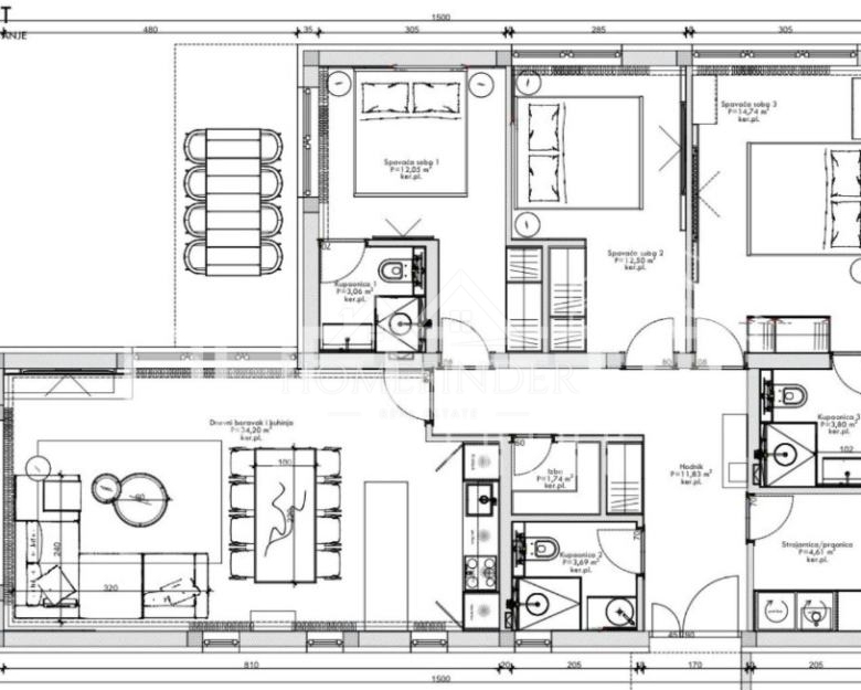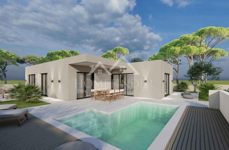 Projekt moderne vile s bazenom – neto površina 125 m², tri spavaće sobe, od kojih dvije imaju vlastitu kupaonicu. Master spavaća soba (18 m²), dvije dodatne sobe (12 m²), jedna s izlazom na natkrivenu terasu i vrt.
