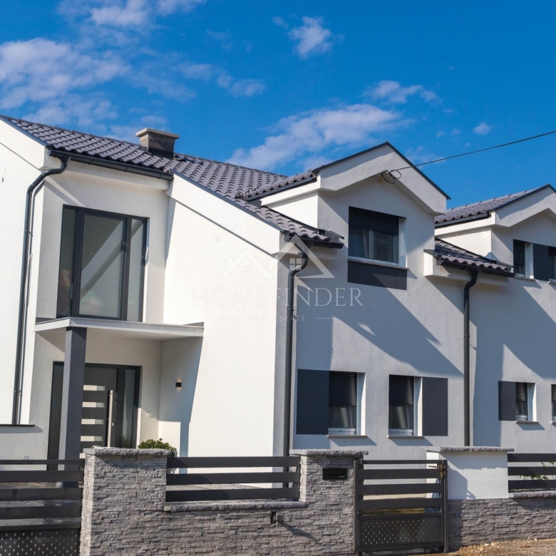 Kuća se proteže kroz tri etaže – suteren, prizemlje i prvi kat – s ukupno četiri prostrane spavaće sobe, svaka s vlastitom kupaonicom. Dodatno sadrži dva WC-a, prostrani open-space dnevni boravak s kuhinjom i blagovaonicom, dvije terase, dva balkona, igraonicu, saunu te unutarnji grijani bazen.
