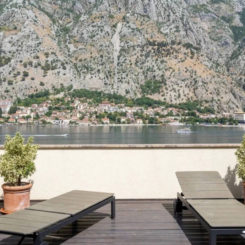 This new, contemporary design house for sale, with an amazing view, is located in Muo, just 30 m from the sea.The house consists of three floors and an attic, with spacious terraces oriented towards the sea.Each floor has an open plan living room, kitchen, dining area, two bedrooms, two bathrooms, and a nice terrace. On the first floor, there is also a pleasant green terrace, suitable for barbecue.The attic floor consists of a kitchen area and a terrace, perfect for sunbathing and enjoyment in the magnificent Boka Bay view.The house is still unfurnished, so the future owner has the freedom to arrange the facilities as he wishes.House is air-conditioned, with under-floor and central heating, video surveillance, and an alarm system.Within the house are three-car garages.House is only 2 km to Kotor Old Town, 12 km from Tivat International Airport, and 15km from Porto Montenegro marina.
