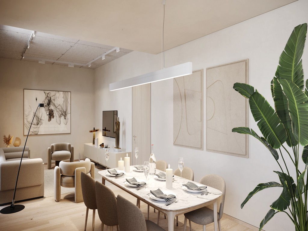 Open-plan living and dining areas with large-format windows
