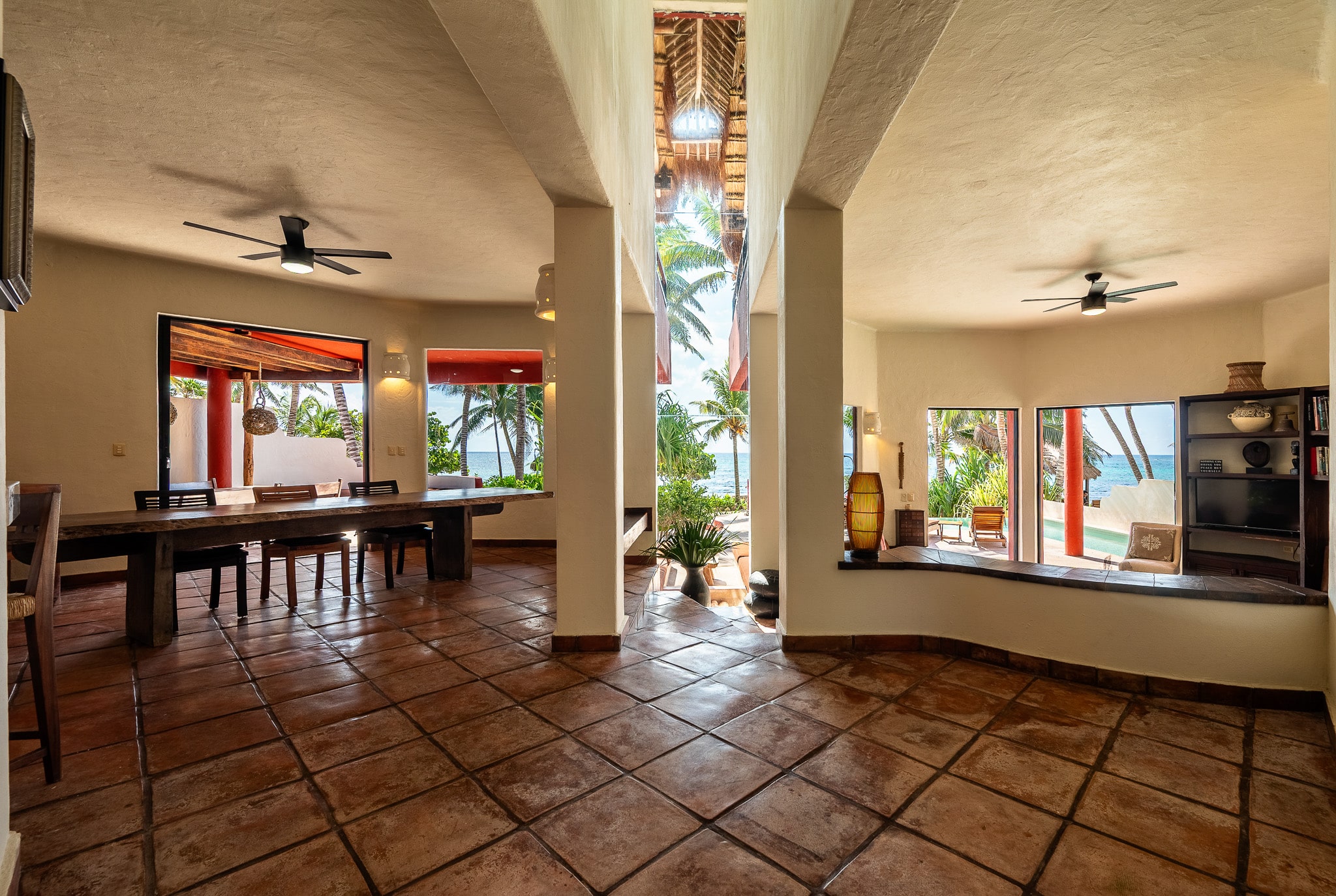 Outdoor spaces are designed for relaxation and entertainment, with a large infinity-edge pool, beachfront lounge areas, and multiple palapas offering shaded retreats. The villa also includes a gated entrance, 24-hour security, and lush gardens, creating a private sanctuary along the coastline.