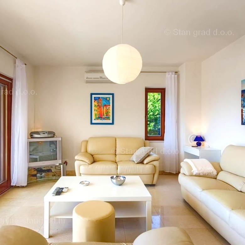 The Stan Grad Immobilien agency is selling an exceptional apartment built according to a modern project in the attractive northern Adriatic area of the island of Krk. This property is located in a top location, integrated into the area of the city center of Krk and in the immediate vicinity of the sea, beach and other tourist attractions. According to the type, this is a spacious one-story apartment that extends over the entire floor of the building. In a first-class building, the apartment is positioned on the 1st floor. The area of this apartment is 100 m2 in total. The specified area includes an entrance hall, living room and kitchen with dining room, 3 bedrooms, 3 bathrooms and a spacious covered terrace. The excellently maintained interior of the property is fully furnished with quality furniture and all necessary technical equipment. Ownership of this apartment also includes the possibility of using the common part of the yard of the building in question. This apartment has a parking space for two cars. In addition to the previous features, the building is perfectly oriented, so the apartment offers a beautiful view of the sea and the coast. This apartment is owned by a natural person, so the buyer is obliged to pay 3% sales tax when transferring ownership to his/her name. The owner of the property guarantees the accuracy of the relevant ownership documents and the possibility of a quick transfer of ownership of the apartment to the buyer. Contact us in person or by phone, we will try to answer all your questions. If you place your trust in us, the Stan Grad Immobilien agency will be happy to help you transfer the ownership rights of this property and the bill for its utility connections and services to your name.