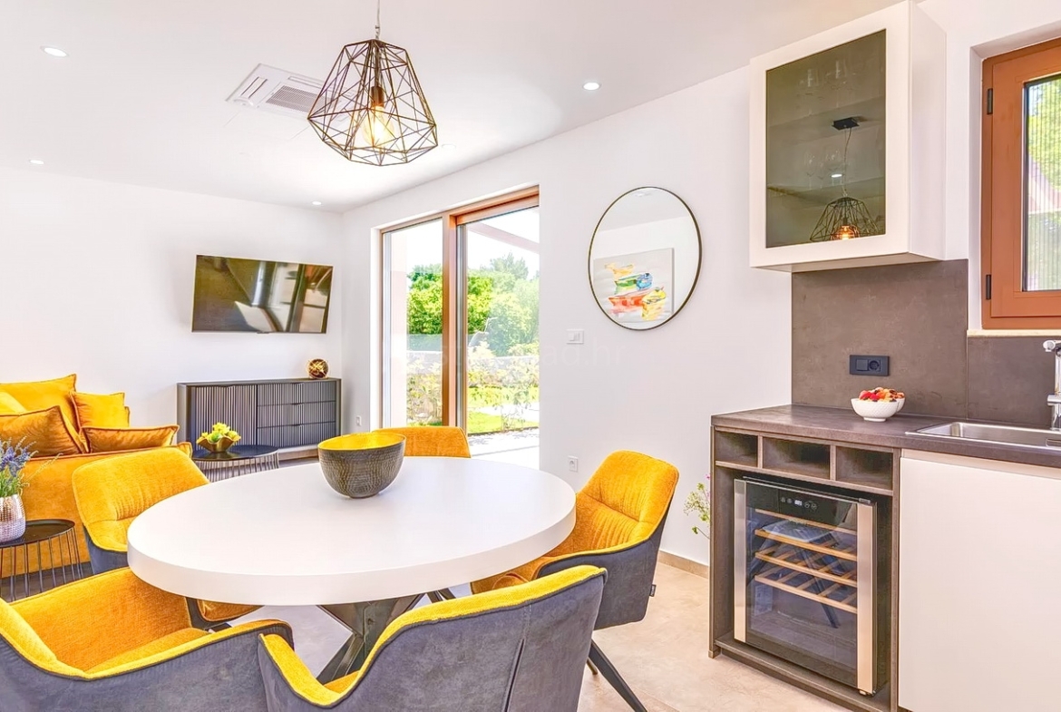 The Stan Grad Immobilien agency in Kvarner has for sale an exceptional Mediterranean urban house built according to a modern project on the developed and attractive northern Adriatic area, the island of Krk. This house is positioned in a quiet location near the town of Krk, not too far from the sea. Structurally, this is a two-story house. The modern built house consists of a space distributed over a total of 2 floors. The property covers a total area of 124 m2. The mentioned area on the ground floor contains an entrance hall, toilet, storage room, bedroom with its own bathroom, open space kitchen with dining room and living room with access to the garden. On the first floor of the house there are two bedrooms, each with its own bathroom, wardrobe and access to a large terrace. The special charm of this property is given by the exceptionally well-kept garden, which includes a swimming pool, sunbathing area, a covered terrace, a summer kitchen and a lounge for socializing. There is enough space in the garden of this house to park two cars. In addition to the above, it should be noted that the house has a beautiful view of this seaside place. This real estate is owned by a natural person and in the name of its transfer, the buyer of the house is obliged to pay real estate sales tax in the amount of 3%. The owner of the house guarantees a quick transfer of the right to dispose of the property to the buyer. We will warmly welcome you in Kvarner, at the prominent address of our office on the island of Krk. The professional team of our agents will be happy to help you during the process of registering ownership and transferring utility connections to your name.