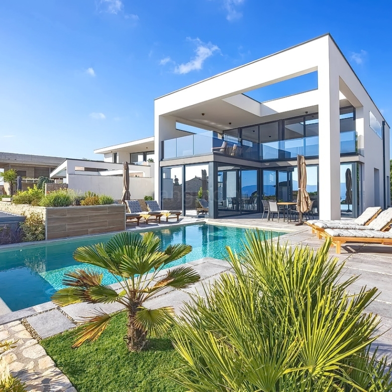As part of the rich real estate offer in the Kvarner region, Stan Grad Immobilien presents a modern, designer holiday home for sale, located in the Mediterranean surroundings of the northern Adriatic, on the island of Krk. This beautifully designed property is situated in a peaceful area near the town of Krk, just a short drive from the sea.