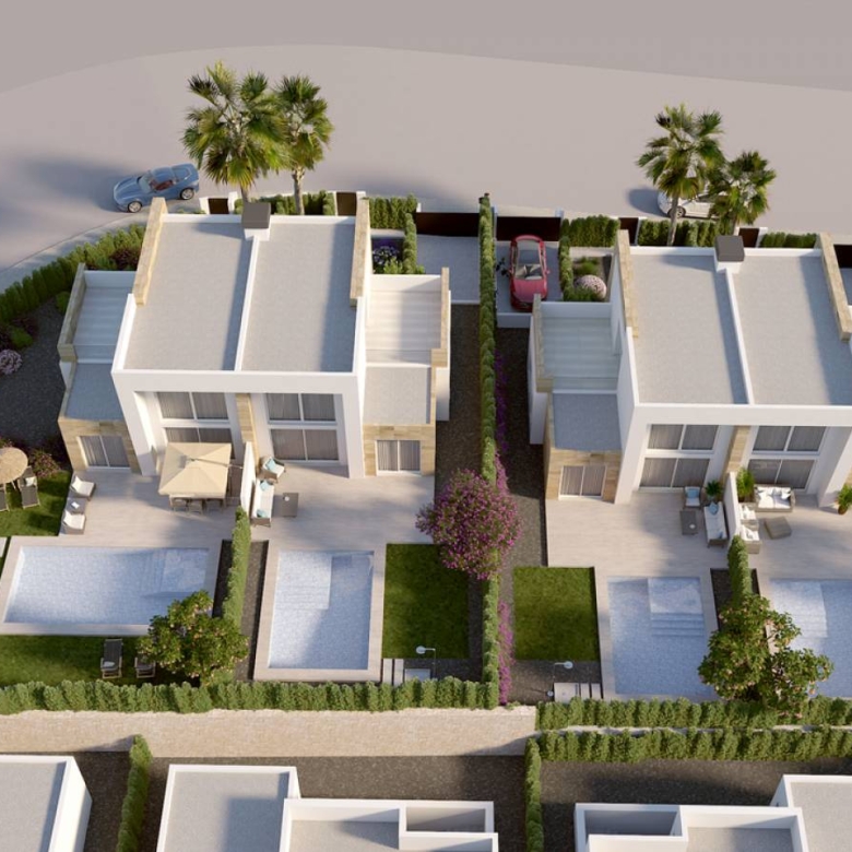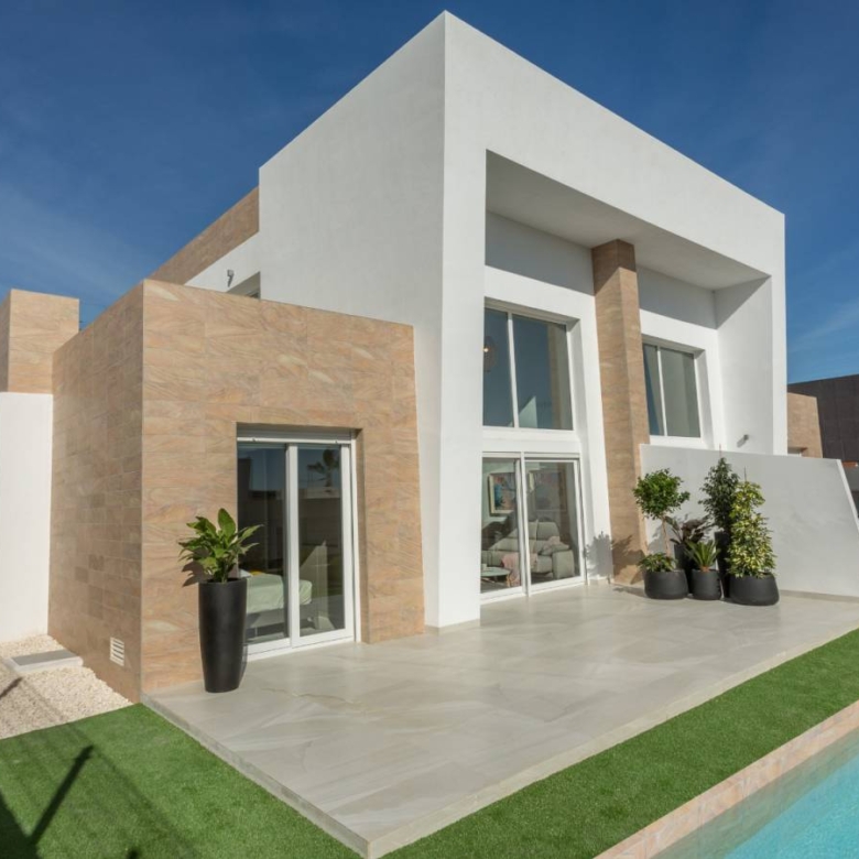 Semi-detached in La Finca Golf, Algorfa, Costa Blanca These properties are located in one of the most exclusive and privileged areas of the Costa Blanca South, surrounded by the nature and tranquillity that characterises La Finca Resort. On the ground floor, there is a bright living room that connects with the dining room and the kitchen with breakfast bar, creating a spacious environment to receive family and friends. From the living room we give way to a large garden with private swimming pool. It also has 2 bedrooms and 1 bathroom fully equipped with washbasin, mirror, complete shower screen and underfloor heating for greater comfort. On the first floor is the master bedroom with panoramic views to the exterior, private bathroom and access to the solarium. In addition, each bedroom includes ample wardrobes to maximise storage space. You can also decide whether you want your home with or without a basement: In short, this home has a smart and balanced layout, perfect for accommodating a large family in one space without compromising on comfort and style. This impressive two-storey home offers a perfectly organised layout designed to provide comfort and functionality in each of its spaces. Property ID: GH-24267-D Price: €565,000 Property Size: 150 m2 Land Area: 460 m2 Bedrooms: 3 Bathrooms: 2 Property Type: Villa Property Status: For Sale