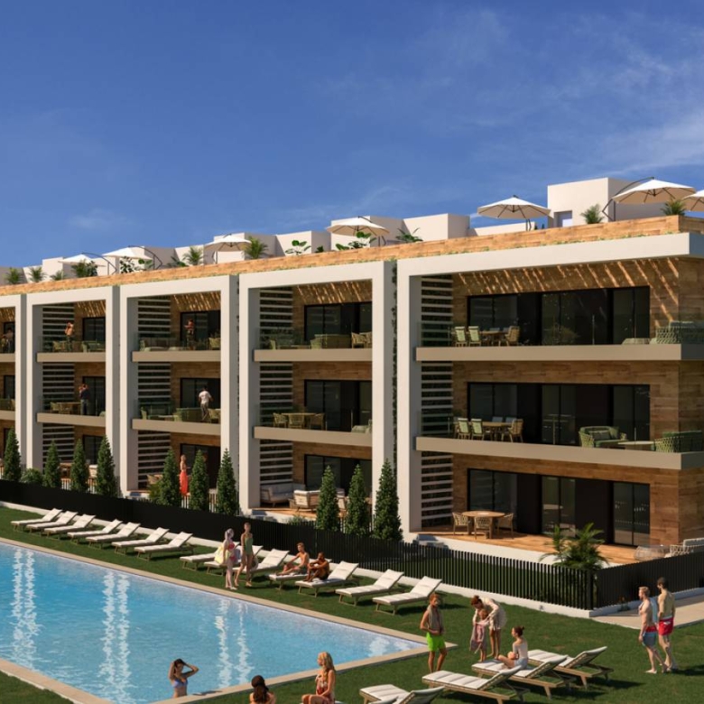 Apartments in La Serena Golf, Los Alcazares, Murcia This project of 244 flats divided into 8 blocks and 20 private Villas is located within the golf course of La Serena, in Los Alcazares. The first phase to go on sale is block 8, consisting of 34 flats, on 3 levels, ground floor, first floor and penthouses. The ground floors have a beautiful garden, some with private swimming pool, and the second floors (penthouses) have a private solarium with access from the inside of the property. The corner flats have 3 bedrooms, as do all the second floor flats, while the rest are 2-bedroom apartments. The properties include an underground garage and storage room. In this first block we have two orientations available, East facing, with views towards the communal areas of the residential and West facing, with spectacular views of the golf course. Property ID: GH-24298 Price: €218,000 Property Size: 83 m2 Land Area: 83 m2 Bedrooms: 2 Bathrooms: 2 Property Type: Apartment Property Status: For Sale
