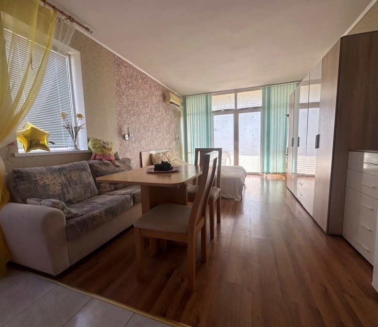 Large pool view studio, 56 sq.m., in Semiramida Gardens, center of Sunny beach KC Properties would like to present you this large studio apartment located in Semiramida Gardens in the center of Sunny beach. The property is situated on the 5th floor and offers open views to both pools in the complex. Distance to the beach is 400 m. The apartment has a total living area of 56 sq.m. and comprises of: – Open-plan kitchen with lounge and bedroom area; – Bathroom/toilet; – Big balcony offering nice open views to the surroundings. The apartment is fully furnished and has equipped kitchen, sofa-bed, double bed, air-conditioner. The bathroom is equipped with shower cabin, toilet, wash basin and electric boiler. The size of the property allows to be converted into 1 BED apartment. About the complex: The complex is situated in the central part of the resort within 400 m to the sea. Within short walking distance there are many supermarkets, restaurants, banks, bus stop. Aqua park is about 500 m away. The complex offers: – 2 swimming-pools; – Children’s playground; – Landscaped gardens; – Bar; – Parking; Annual maintenance fee – 8 EUR/sq.m.