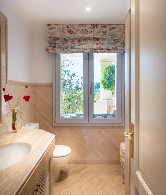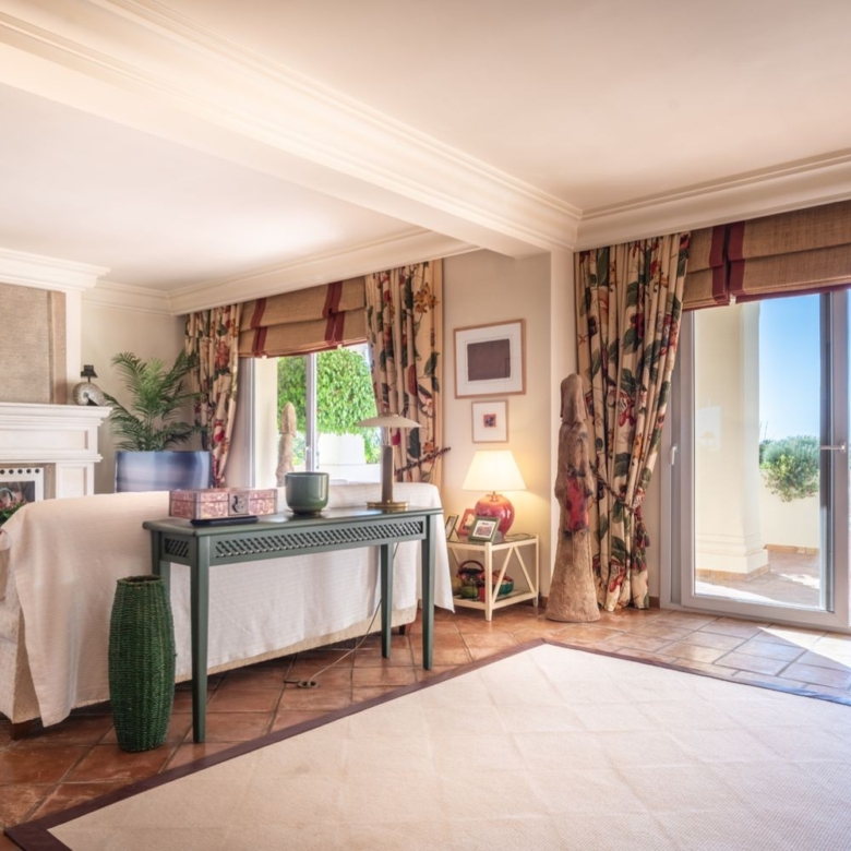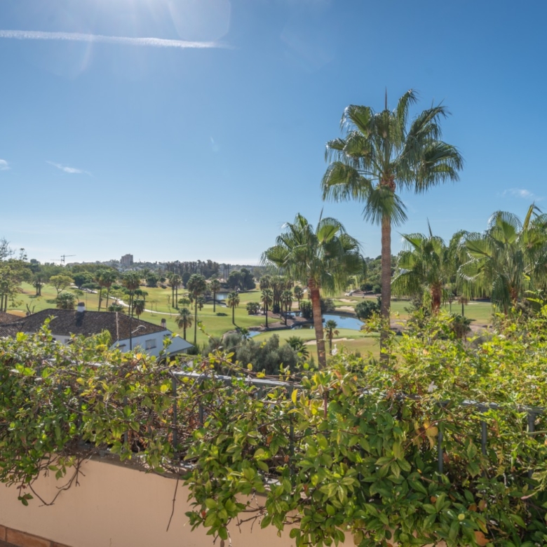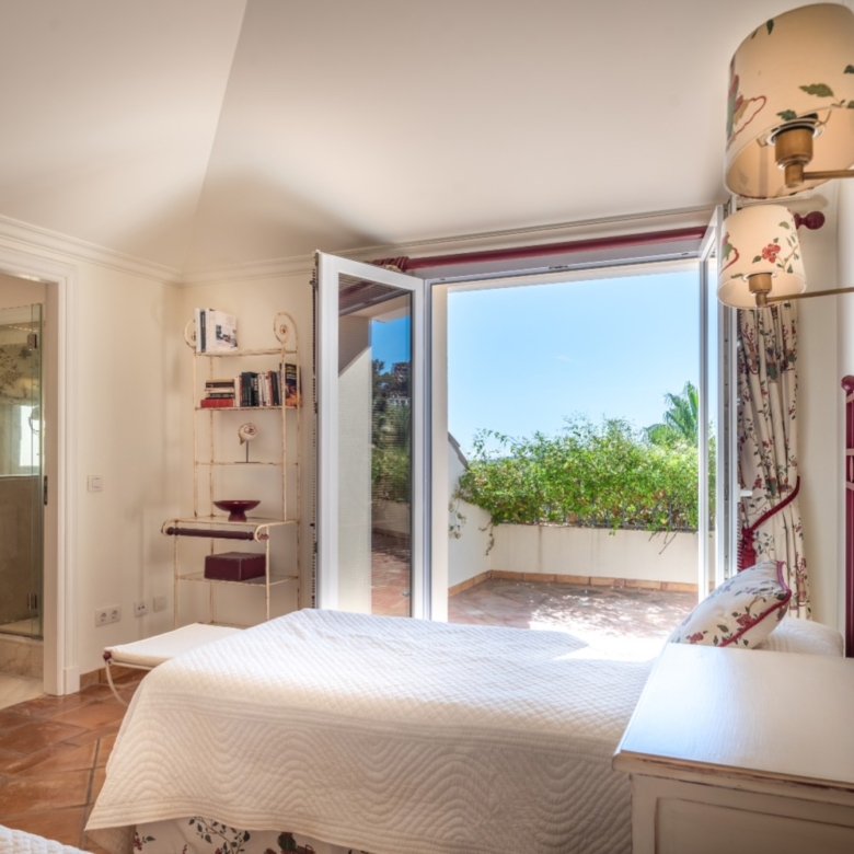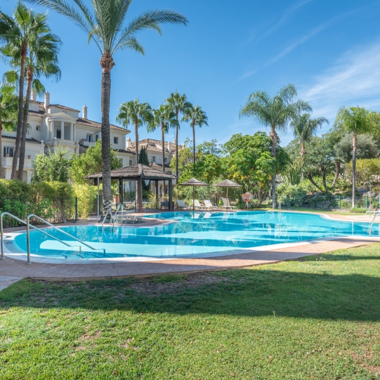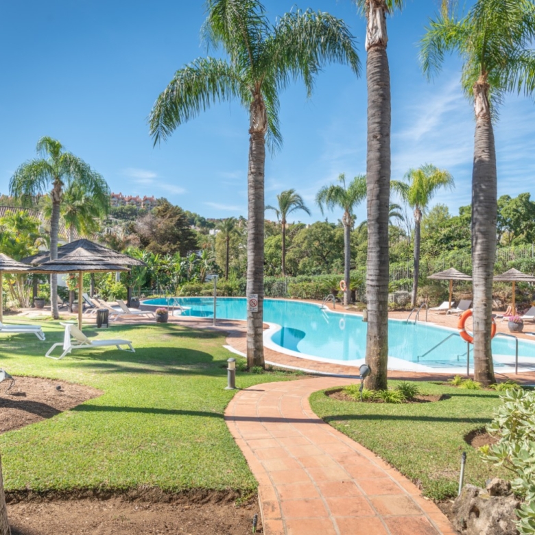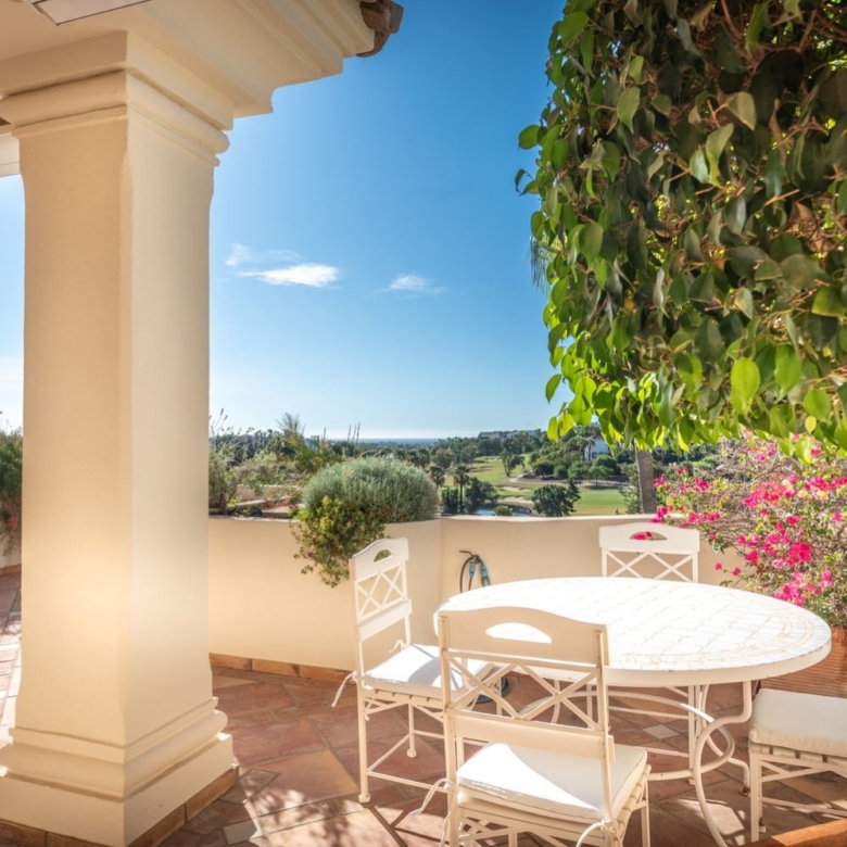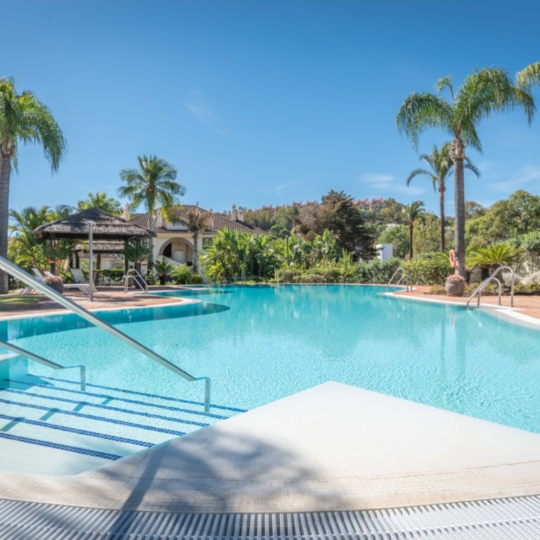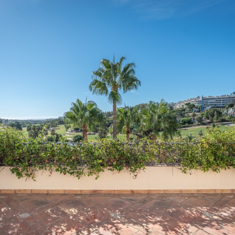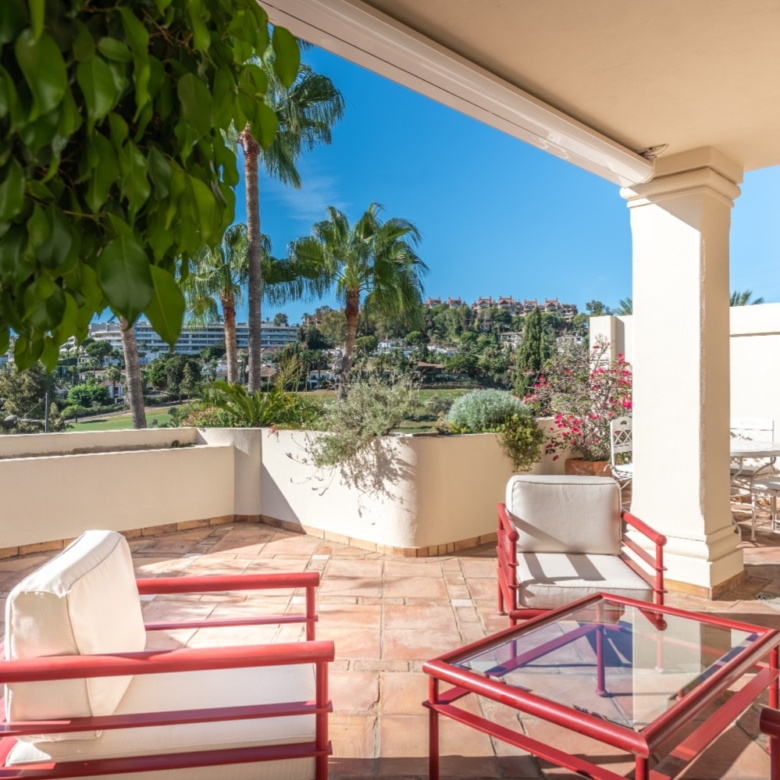 Presenting a unique opportunity to acquire an outstanding 3-bedroom duplex penthouse in the highly desirable Las Alamandas. This gated complex offers 24-hour security, three swimming pools (including a heated pool), beautifully manicured tropical gardens, a gym, and a sauna. Ideally situated between Los Naranjos Golf Club and Las Brisas Golf, this development is a favorite among golf enthusiasts. Residents can enjoy easy access to a variety of amenities, including shops, supermarkets, restaurants, Puerto Banús, and local beaches. The apartment boasts the highest standards of quality, featuring premium flooring and a sophisticated air conditioning and heating system throughout. The spacious living and dining area opens onto a terrace that provides both sun and shade all day long, offering stunning views of the swimming pool, gardens, and La Concha mountain from the rear terrace. The fully equipped kitchen includes a utility room, complemented by a welcoming hall and a cloakroom. The three generously sized bedrooms come with en-suite bathrooms, equipped with underfloor heating, powerful shower/bath combinations, double vanity units, and a Jacuzzi in the master suite. The purchase price includes two garage spaces and one storage room.