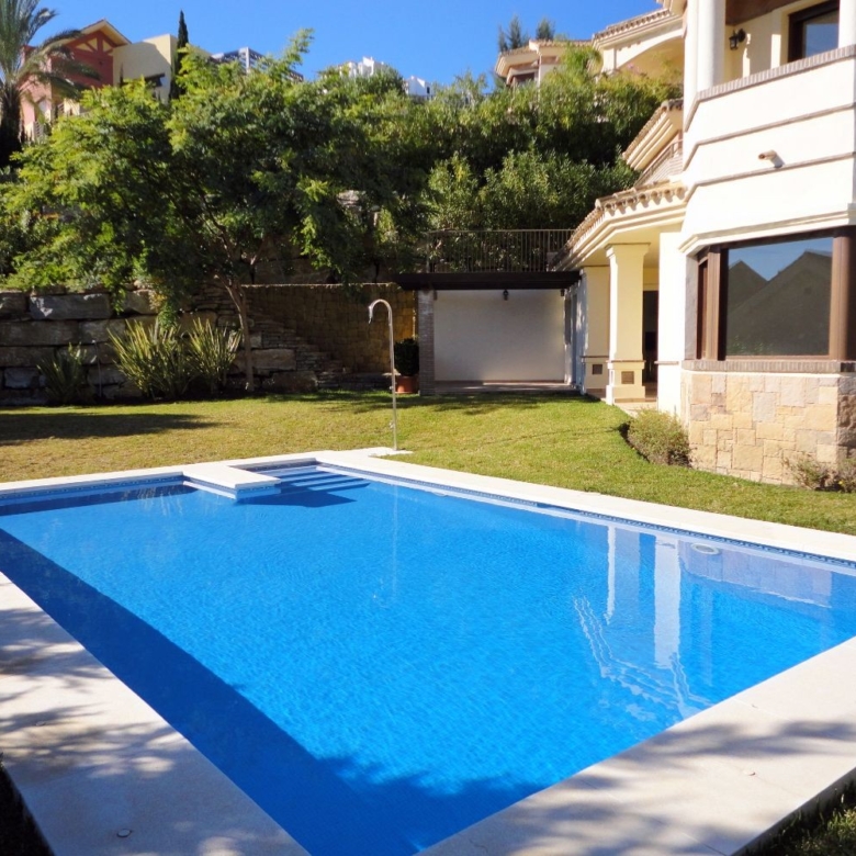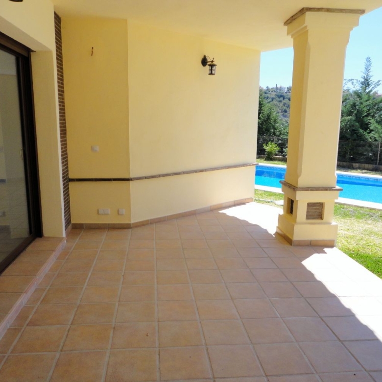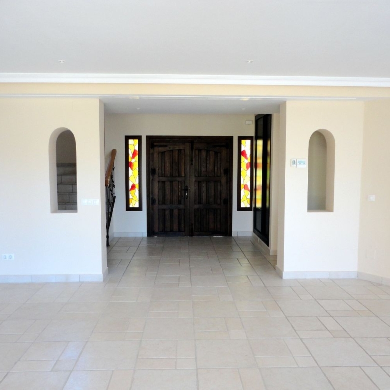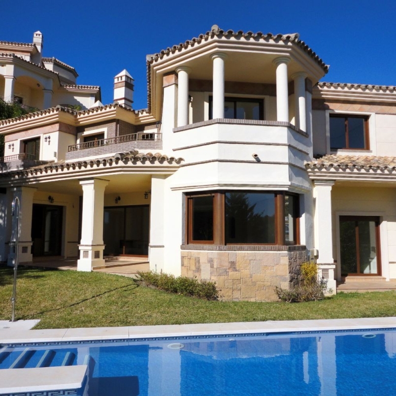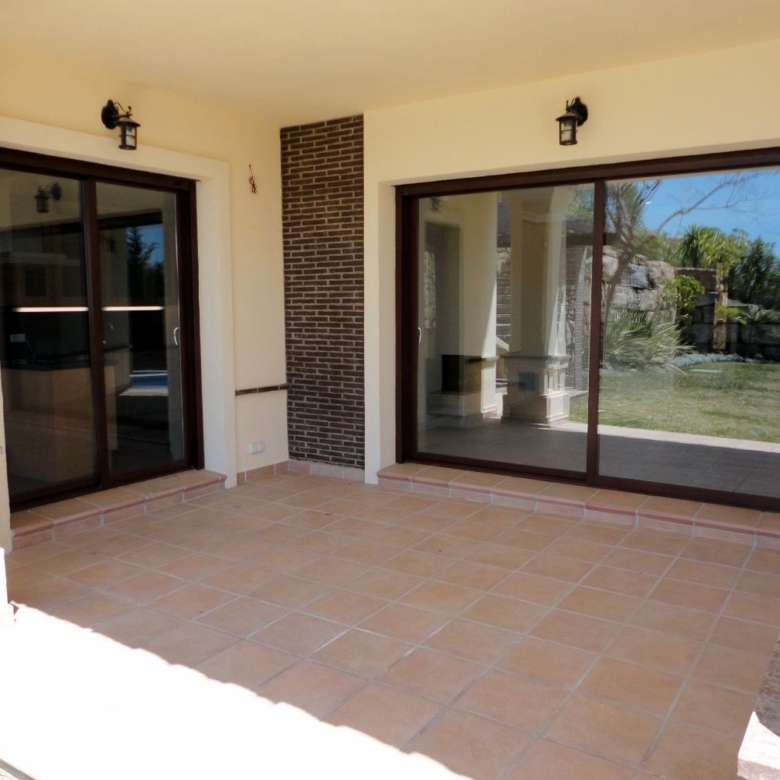 This stunning Mediterranean villa is situated within one of the most exclusive private estates in the Marbella area. Los Arqueros Golf is a mature gated community with 24 hour security. It has it’s own 18 hole golf course (designed by Seve Ballesteros), an impressive club house with an excellent restaurant, tennis courts and gym. The club house, driving range and all sports facilities are within walking distance of the property. The villa is situated in a prime residential street and enjoys a prized site in an elevated position with spectacular views of the golf course and the sea. The villa stands on a plot of 1000 m2 of which 470 m2 is the total built area and 56 m2 is in terraces. The property, one of a kind, which was built in 2006, has some beautiful and user friendly design features. The quality of material and finish is obvious throughout the villa, showing that attention to detail and care was taken with selection and installation. The villa features designer ceramic tiles throughout and the unique fireplace adds a special character to the living room. The master suite has a large walk in closet and two terraces with views to the golf course and sea from both. The closets throughout the house were designed and fitted by The Metropolitan Closet Company. Access to the AP7 toll highway is 5 minutes. Malaga and Gibraltar airports are a 40 minute drive, with Puerto Banús and Marbella being 8 and 12 minutes respectively. The beautiful village of Benahavis, dubbed the ‘gastronomic village of Andalucia’ is a 10 minute drive. This luxurious villa is free of defects and would make an ideal family home plus an excellent investment due to its size, quality, unique features, and most importantly its close proximity to both Puerto Banús and Marbella. An added attraction is that water is heated by solar energy hence a substantial reduction in running costs. The villa has been well maintained and is in excellent decorative order.