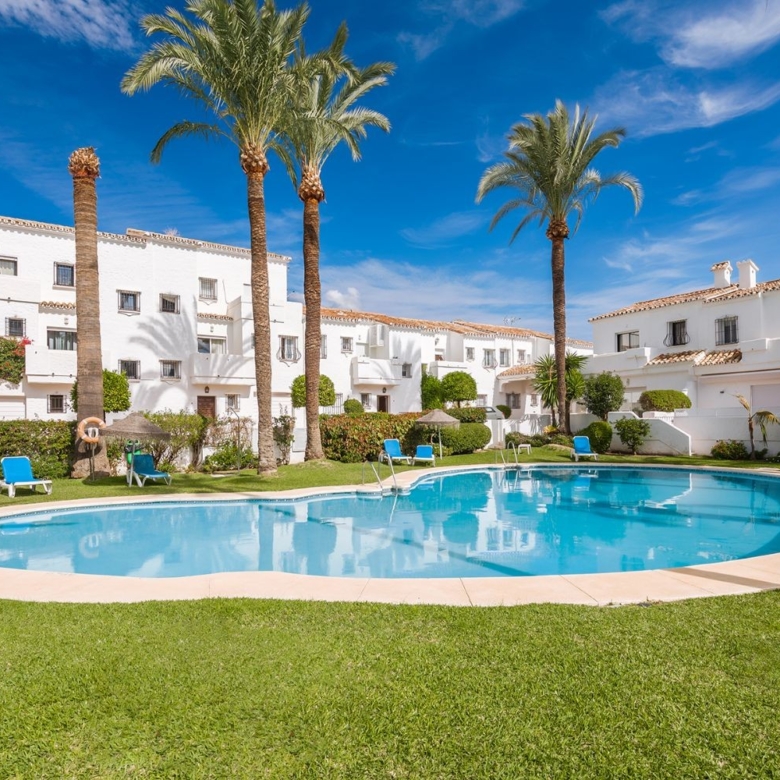 Charming frontline golf townhouse situated in a sought after secure development in Las Brisas/ Nueva Andalucia. The property has been recently refurbished and on the ground level consists of an open plan living, dining area and fully fitted kitchen, with access to a good size terrace with stunning views over the golf course and the mountains. On this level there is also a double bedroom and a guest toilet. On the upper level there is the spacious master bedroom suite with fitted wardrobes and access to a good size terrace with golf views and a further guest bedroom with en suite bathroom and fitted wardrobes. The community has 2 large swimming pools, tennis and squash courts, 24-hour security and there is also an on site restaurant. Other features include: hot and cold air conditioning, wooden floors in the bedrooms and bathrooms, fireplace, etc. Ideal family home for holiday or all year roundliving.