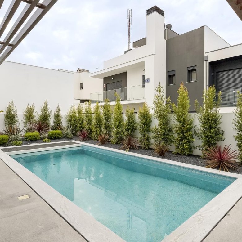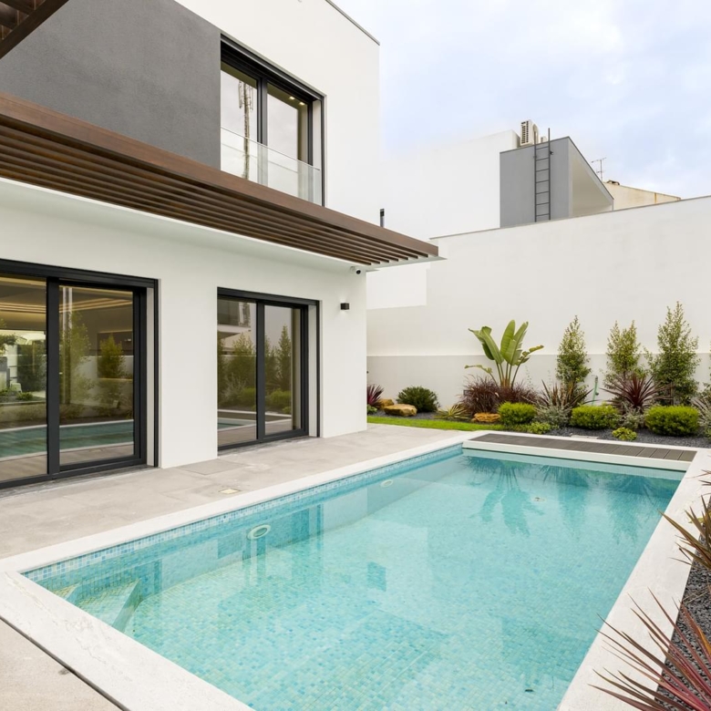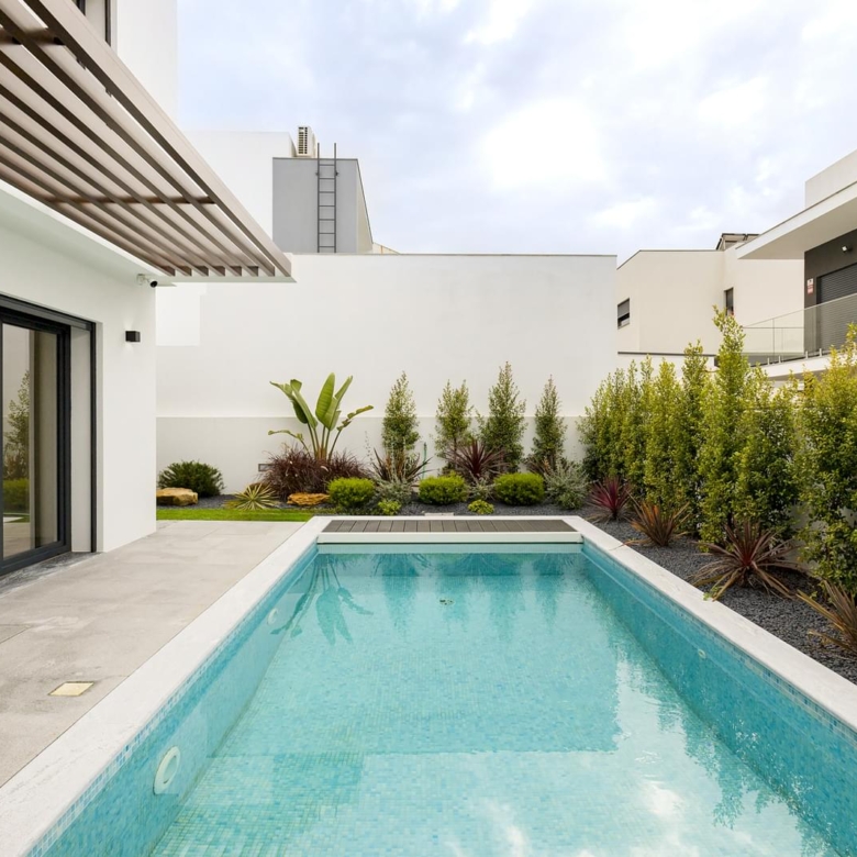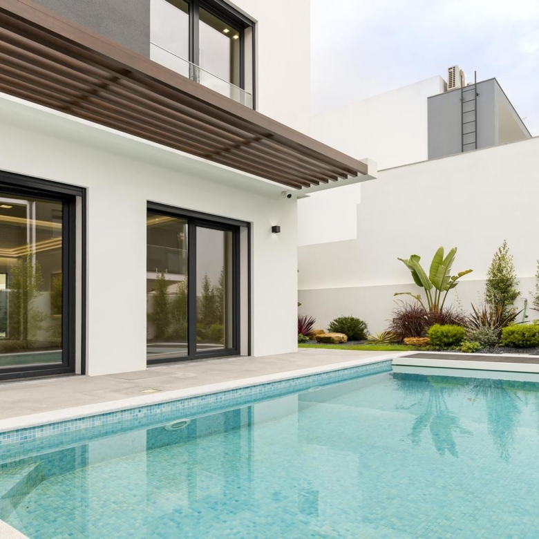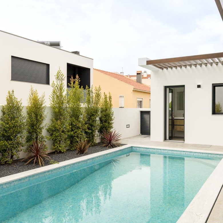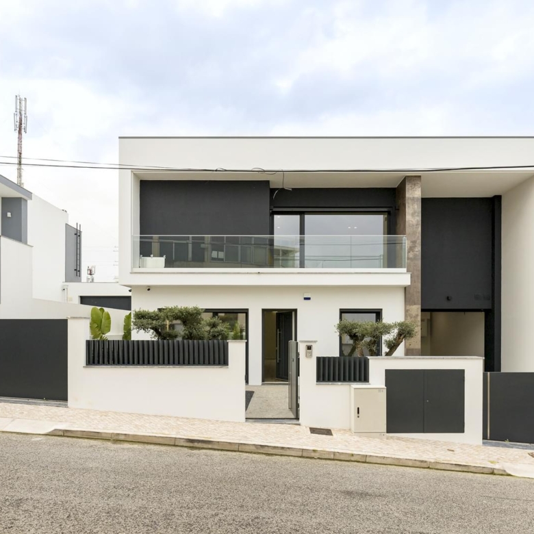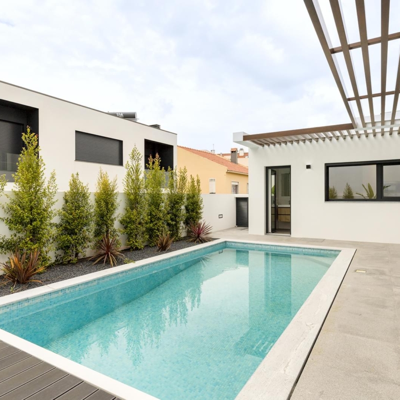 3+1 Contemporary Villa with a Differentiated Design and Swimming Pool in Bobadela This stunning contemporary villa, located in the Telefones neighbourhood, in Bobadela, stands out for its distinctive design and exclusive amenities. With a 190 sqm private gross area, implanted in a 310 sqm generous plot of land and with an excellent sun exposure, this property offers the perfect balance between luxury and functionality. Distribution of the Areas: Ground floor: Spacious living room: 58.70 sqm, with direct access to the garden and swimming pool, providing an atmosphere of conviviality and entertainment. Fully equipped kitchen: 12 sqm, ideal for culinary enthusiasts. Office/Bedroom: 9 sqm, versatile and adaptable to the needs of the residents. Full private bathroom: 6 sqm, combining elegance and practicality. Garage: 20 sqm, ensuring convenience in parking. Swimming pool: 19.20 sqm with bathroom, encircled by a surrounding outdoor area totalling 61 sqm, creating an exquisite leisure environment. First Floor: Master suite: 19 sqm, with balcony and a walk-in closet, providing a private and elegant retreat. Suite: 14 sqm, supported by a 5.5 sqm bathroom, blending comfort and privacy. Suite: 17 sqm, with an 8 sqm balcony, a 6 sqm closet and supported by a 5.5 sqm bathroom, ensuring distinct and functional spaces. Equipment and Amenities: Triple glazed PVC window frames for thermal and acoustic insulation. Hydraulic radiant floor heating through a Vaillant heat pump, with a pre-installation of air conditioning. Electrical blinds and a central vacuum unit for convenience and practicality. Solar panels for energy efficiency. Light system with motion sensors to optimize consumption. Video intercom, ensuring security and access control. Swimming pool with automatic cover for convenience and safety. Automatic gate and accessibility for people with reduced mobility. Prime Location: Close to transportation options, beaches, bicycle paths, schools, restaurants and local business. Just 10 minutes away from Parque das Nacões and its surrounding area. This villa is a real opportunity for those who are looking for a sophisticated lifestyle, combining contemporary design, comfort and convenience in perfect harmony. Property ID: PDF-PF32672 Price: €870,000 Property Size: 188.18 m2 Bedrooms: 3 Bathrooms: 5 Property Type: House Property Status: For Sale