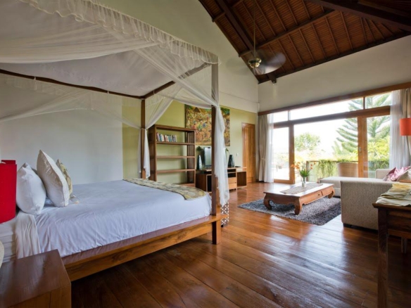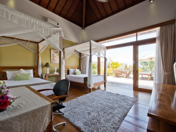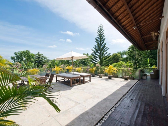 Consisting of 4 ensuite bedrooms featuring a large master bedroom on the second level with a king size four poster teak bed, cozy living space, balcony, a gorgeous bathroom with a free-standing tub and both indoor and outdoor showers. Ladies would fall in love with the walk-in wardrobe. A twin bedroom can also be found on the second floor while the other two bedrooms can be found downstairs with views of the pool and garden. The highlight of the villa is the 25 metre salt water swimming pool and deck – a great place to entertain and enjoy with family and friends. The villa also has a huge landscaped garden, 3 additional guest toilets, staff room, 2 carports in the villa compound along with 6 outdoor parking spaces. Access to the villa is via a 9-metre asphalt road. The villa is impeccably furnished throughout.