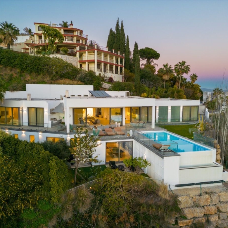 This modern and luxurious villa is located in the exclusive gated community of El Herrojo, in La Quinta. The villa enjoys a stunning hilltop setting with breathtaking panoramic sea views. This contemporary villa features an open-plan layout with high ceilings, floor-to-ceiling windows, and avant-garde interior design that creates a sleek and modern ambiance. The villa also includes a spectacular entertainment level with a wine cellar and a playroom with a TV area. It offers several chill-out areas, perfect for relaxing and soaking up the sunny weather all year round. With its outstanding design, stunning location, and luxurious amenities it is the perfect choice for anyone looking for a modern and exclusive living in a privileged setting close to all amenities and exclusive golf courses.